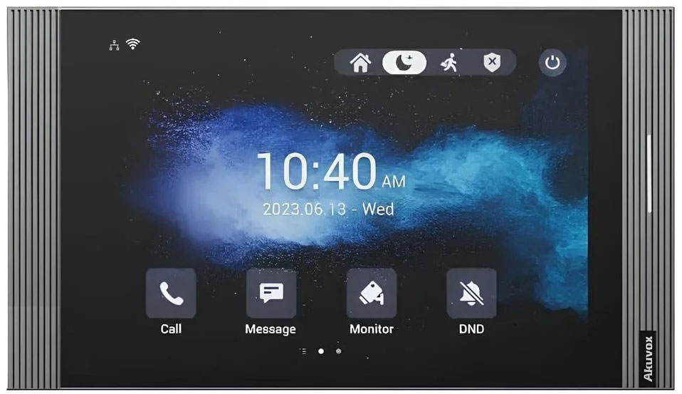 Домофон Akuvox S567W Gray - це високопродуктивний внутрішній IP-відеотермінал преміального рівня, призначений для використання в сучасних домофонних системах і комплексах контролю доступу. Пристрій виконаний у корпусі з міцного пластику з елегантним сірим оздобленням та підтримує настінний і настільний монтаж. Реалізований захист від втручання підвищує фізичну безпеку експлуатації, а живлення може здійснюватися як через PoE IEEE 802.3af, так і від зовнішнього джерела 12 В DC.