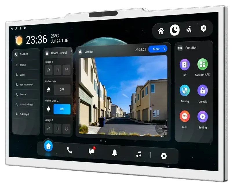 Апаратна платформа побудована на базі операційної системи Android 14, що значно розширює функціональність пристрою та дозволяє використовувати сторонні додатки. Високу продуктивність забезпечує конфігурація з 8 ГБ оперативної пам’яті та 32 ГБ вбудованої пам’яті, яка дозволяє стабільно обробляти відеопотоки, аудіозв’язок, інтерфейс користувача та інтеграційні сценарії без затримок. Домофон оснащений двома адаптивними Ethernet-портами RJ45 10/100 Мбіт/с, а також підтримує Wi-Fi IEEE 802.11 b/g/n/ax (Wi-Fi 6) і Bluetooth 5.3 для бездротових підключень і взаємодії з периферією.