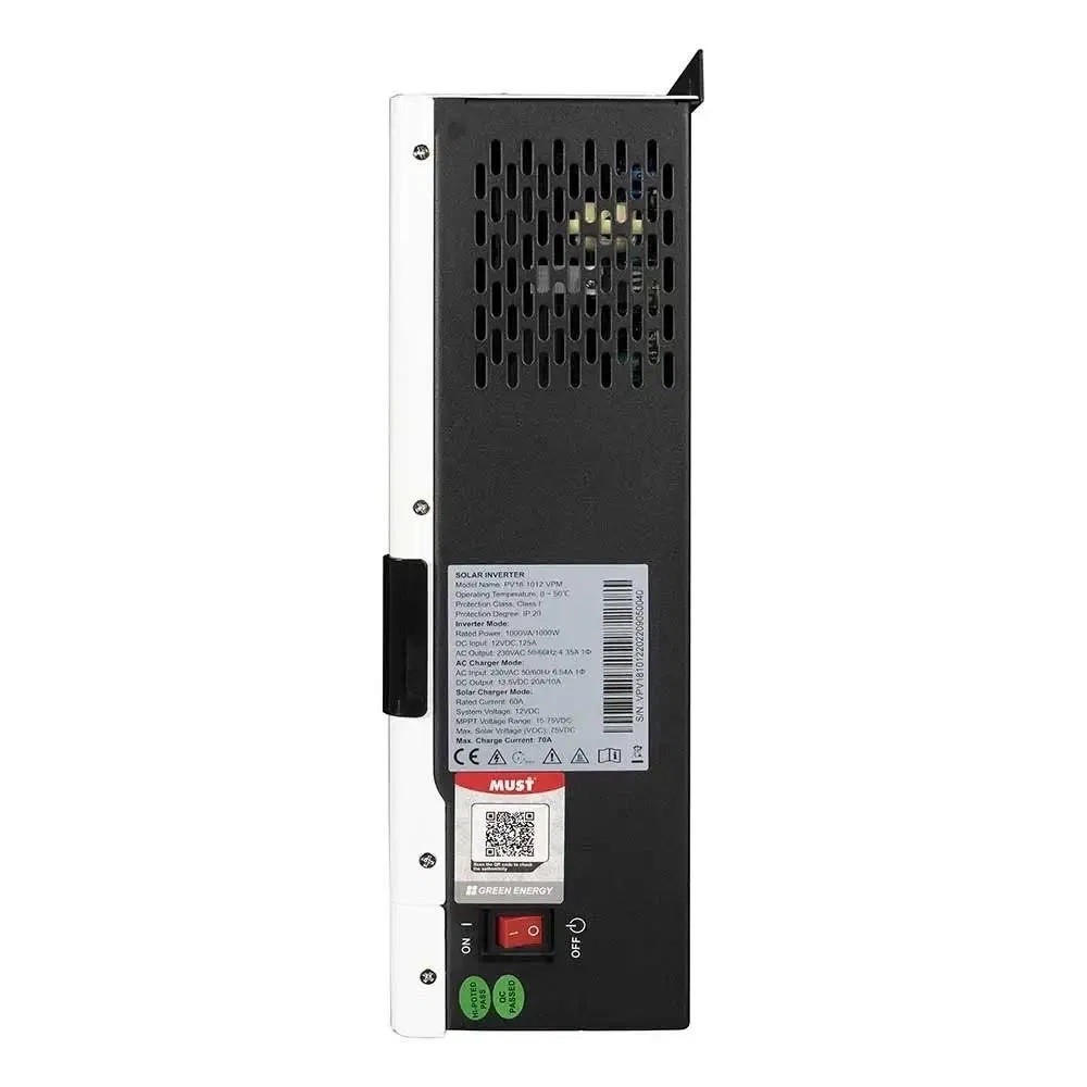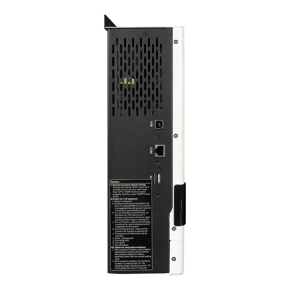 Це універсальний пристрій, який поєднує в собі інвертор, сонячний зарядний пристрій MPPT та зарядний пристрій для акумулятора, забезпечуючи безперебійне живлення. Зручний РК-дисплей надає користувачам можливість налаштовувати різні параметри, такі як зарядний струм акумулятора, пріоритет зарядного пристрою (змінного струму або сонячного), та прийнятну вхідну напругу залежно від потреб.
