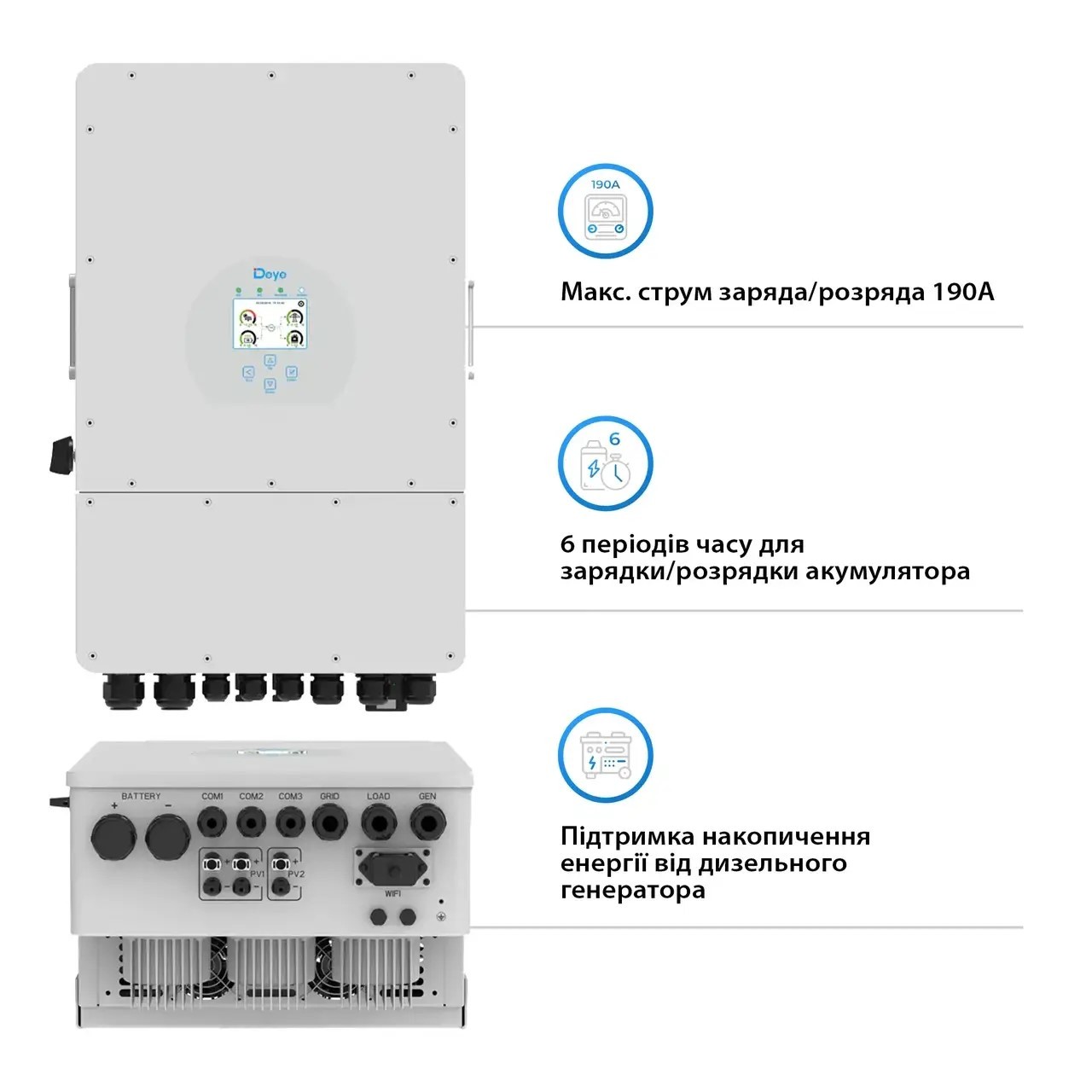 Deye SUN-8K-SG01LP1-EU WiFi має три основні варіанти генерації сонячної енергії та дозволяє обмежувати обсяг генерації, а також вибирати пріоритет використання сонячної енергії.