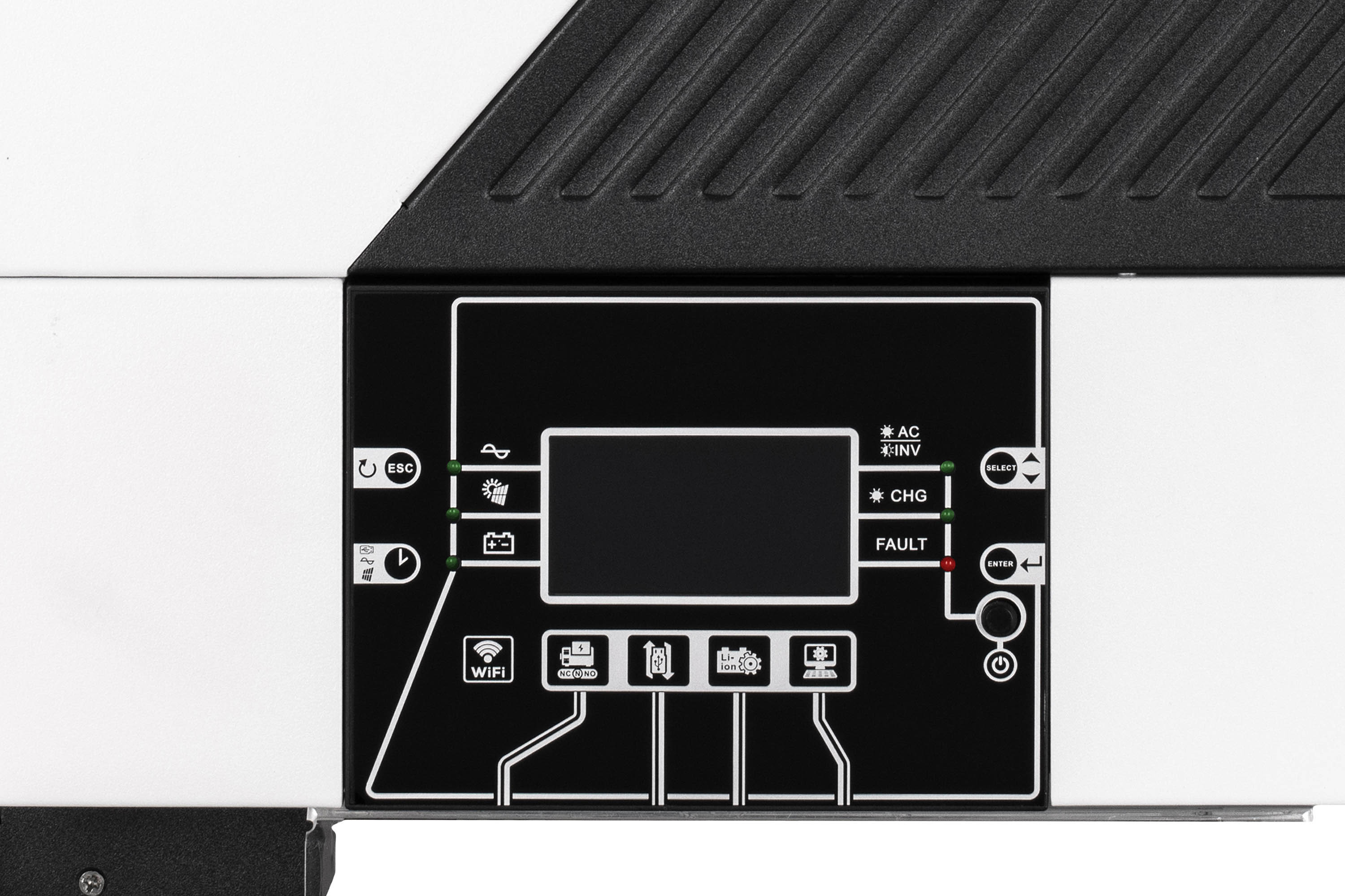 Крім того, у разі потреби до інвертора також можна додатково під’єднувати батареї різних типів 48 В, при цьому максимальний струм ЗП становитиме 120 А (комбінований). Загалом щодо можливостей застосування, то потужності інвертора вистачить, аби заживити основні системи (опалення, водопостачання, кондиціонування), наприклад, котеджу або підприємства до 150 м².