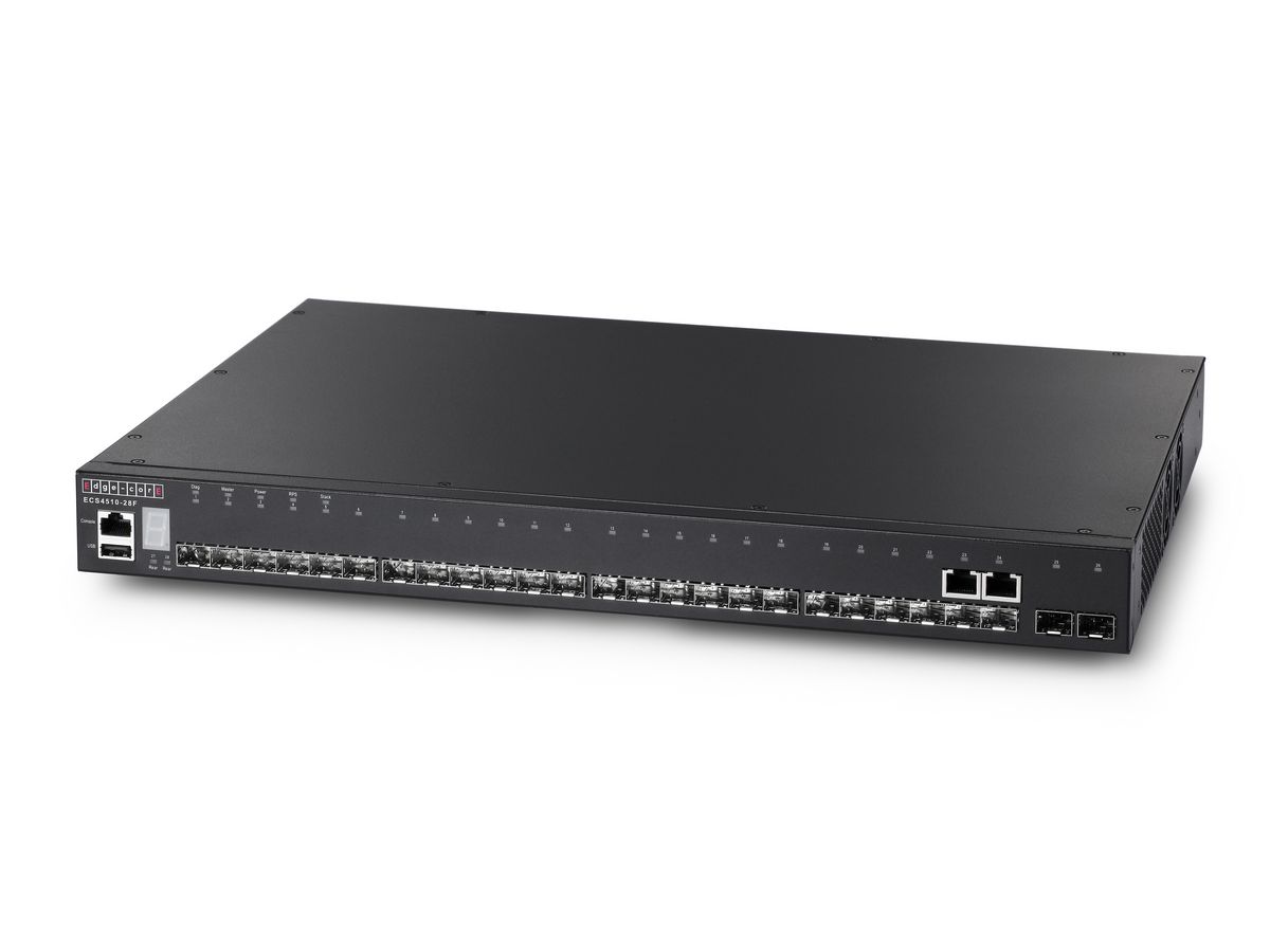 Edge-Core ECS4620-28F – має 28 портів, з них 22 SFP порта 100FX/1000Base-X, 2 комбінованих порта - 1000Base-T/SFP, 2 10G SFP + порта і опційно 2 10G SFP + порта, які можна додати використовуючи модуль розширення EM4510-10GSFP+.