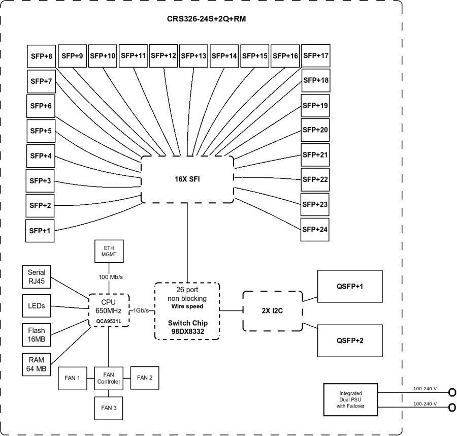 CRS326-24S+2Q+RM прост в управлении - у него полноразмерный USB порт для конфигурации и два блока питания для резервирования - никаких неожиданных простоев, ваши клиенты и коллеги будут благодарны! Для загрузки можно выбрать многофункциональную операционную систему RouterOS или более простую, но все же мощную SwOS. Если вам нужна маршрутизация и другие функции 3-го уровня в вашем CRS свитче, используйте RouterOS.