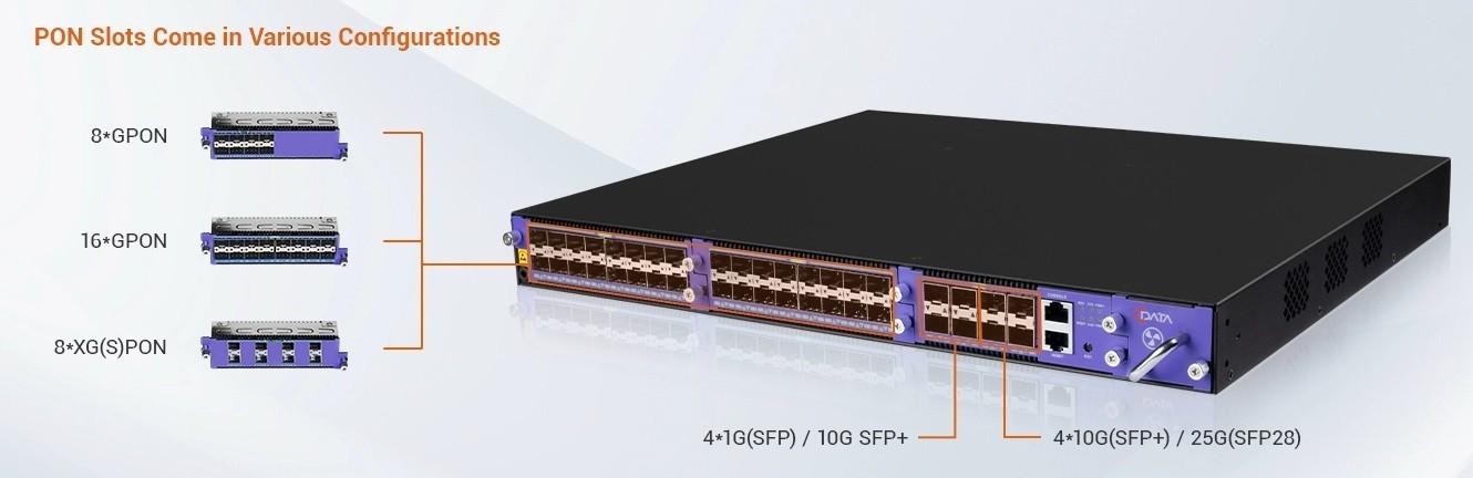 Пристрій оснащений чотирма uplink портами: 4×1G(SFP)/10G SFP+ і 4×10G(SFP+)/25G(SFP28), забезпечуючи високу пропускну здатність для передачі даних. Кожен PON порт підтримує передачу на відстань до 20 км.
