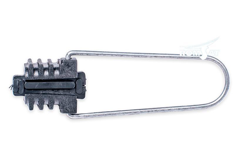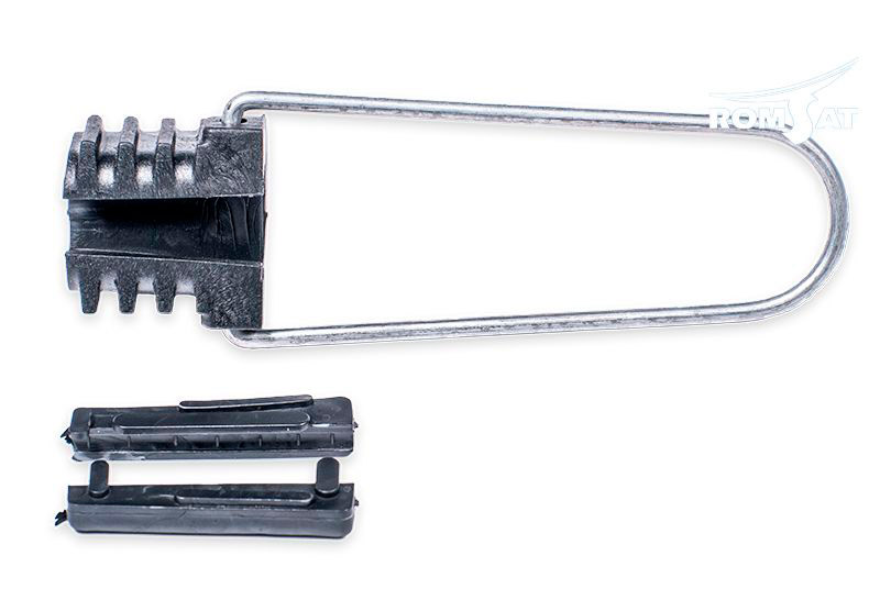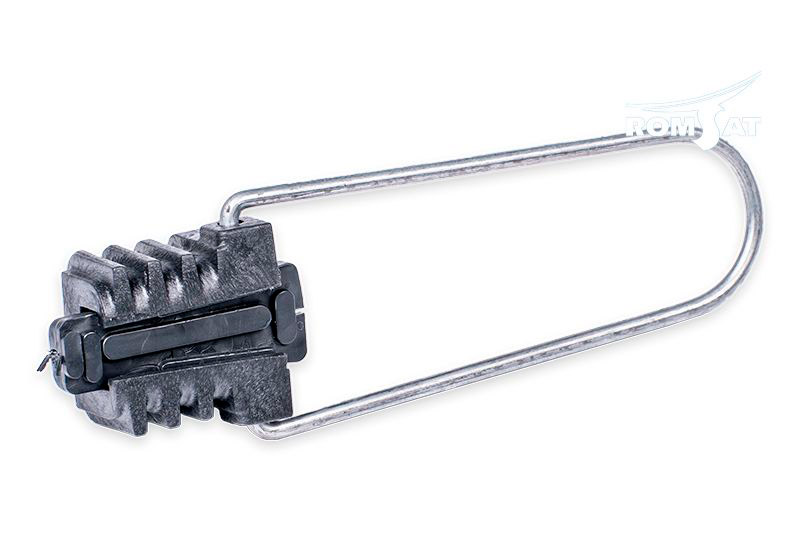 Зажим виготовлений з міцного пластику, стійкого до впливу УФ-випромінювання і перепадів температур. Кріпильну петлю з сталевого оцинкованого дроту Ø5 мм при необхідності можна зняти, що забезпечує додаткову зручність в монтажі. Затискуючі клини утримуються від довільного випадіння спеціальним фіксатором.