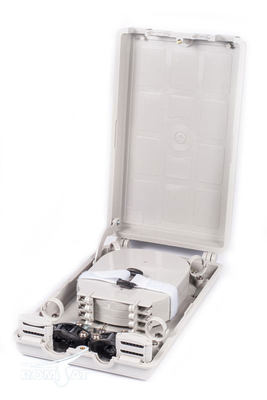 Малогабаритний оптичний бокс для встановлення всередині приміщень. Рівень захисту IP20. Кріплення: до стіни за допомогою дюбелів (у комплекті).