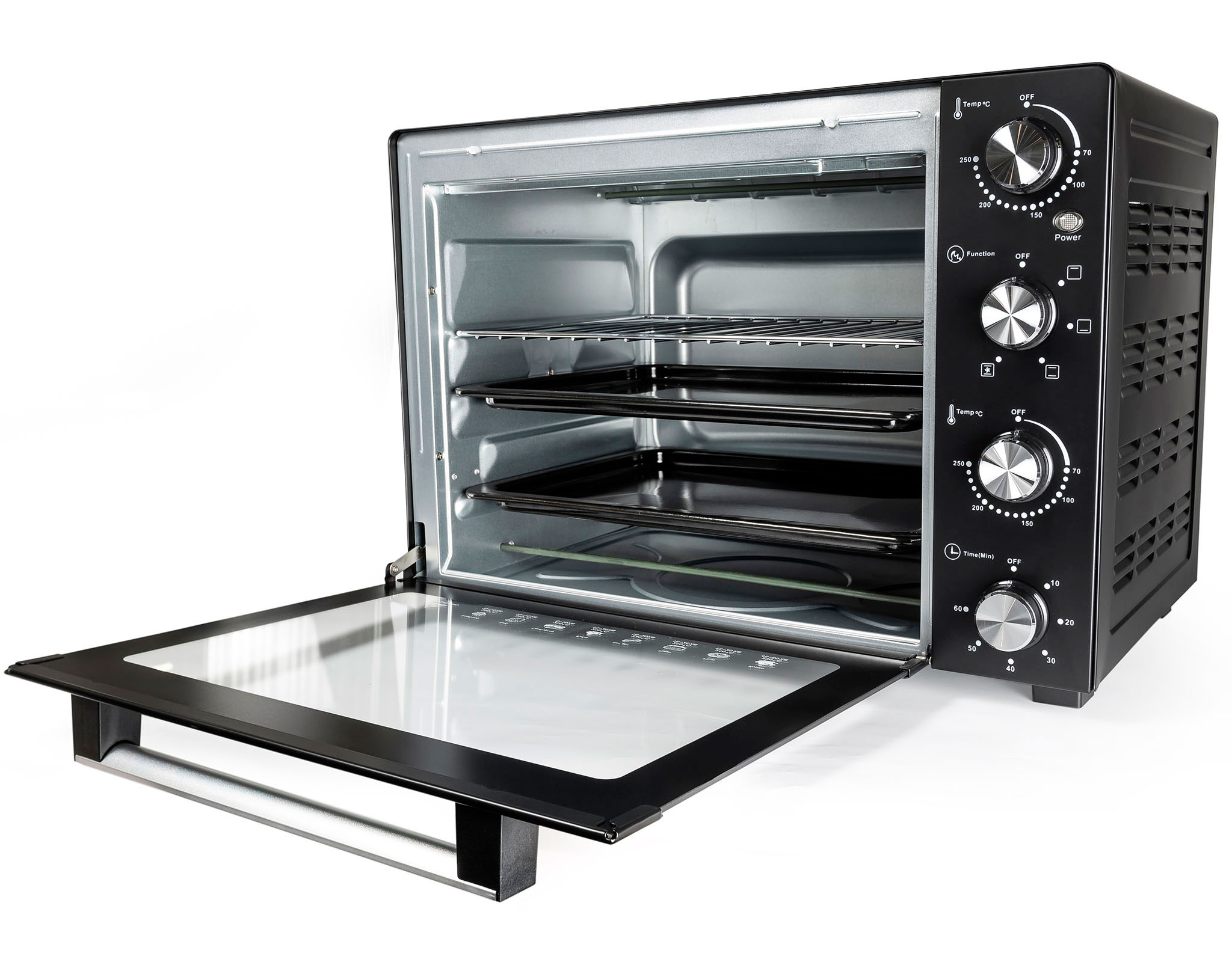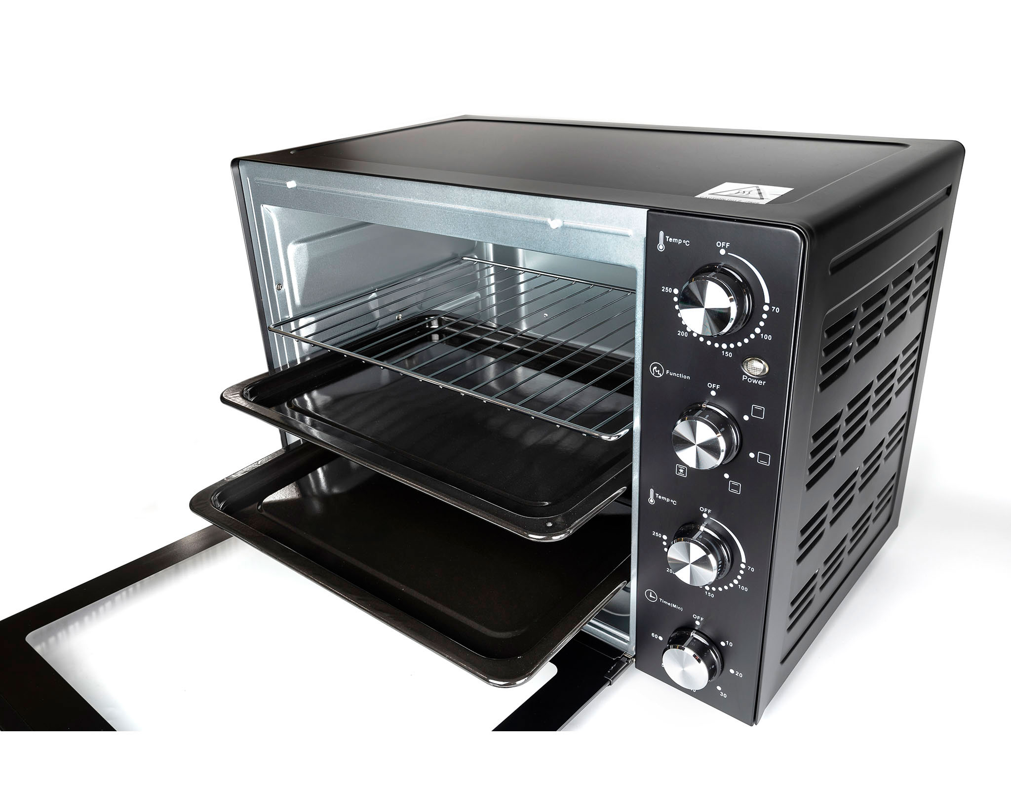 Корпус печі виготовлений з якісних матеріалів: сталь, пластик і скло. Нагрівальні елементи з нержавіючої сталі забезпечують надійність і довговічність пристрою. Чорний колір корпусу додає елегантності та гармонійно поєднується з будь-яким кухонним інтер’єром. Внутрішнє підсвічування та світловий індикатор роботи допоможуть вам стежити за процесом приготування без необхідності відкривати дверцята.