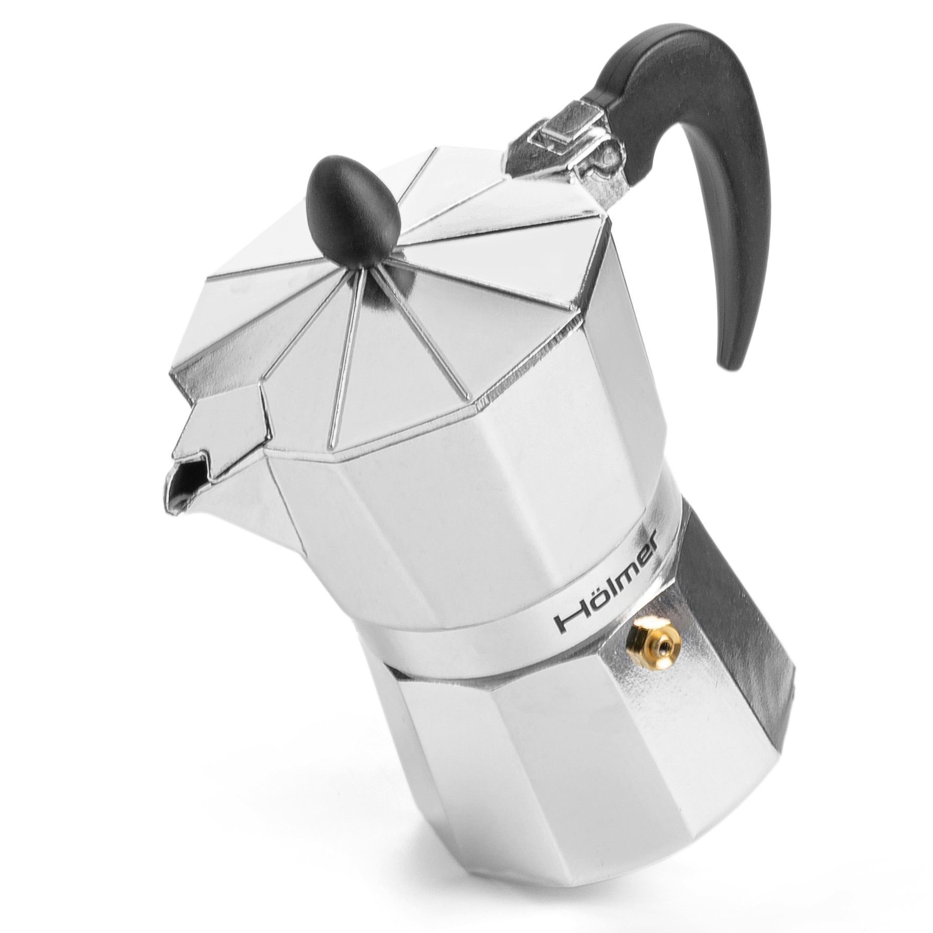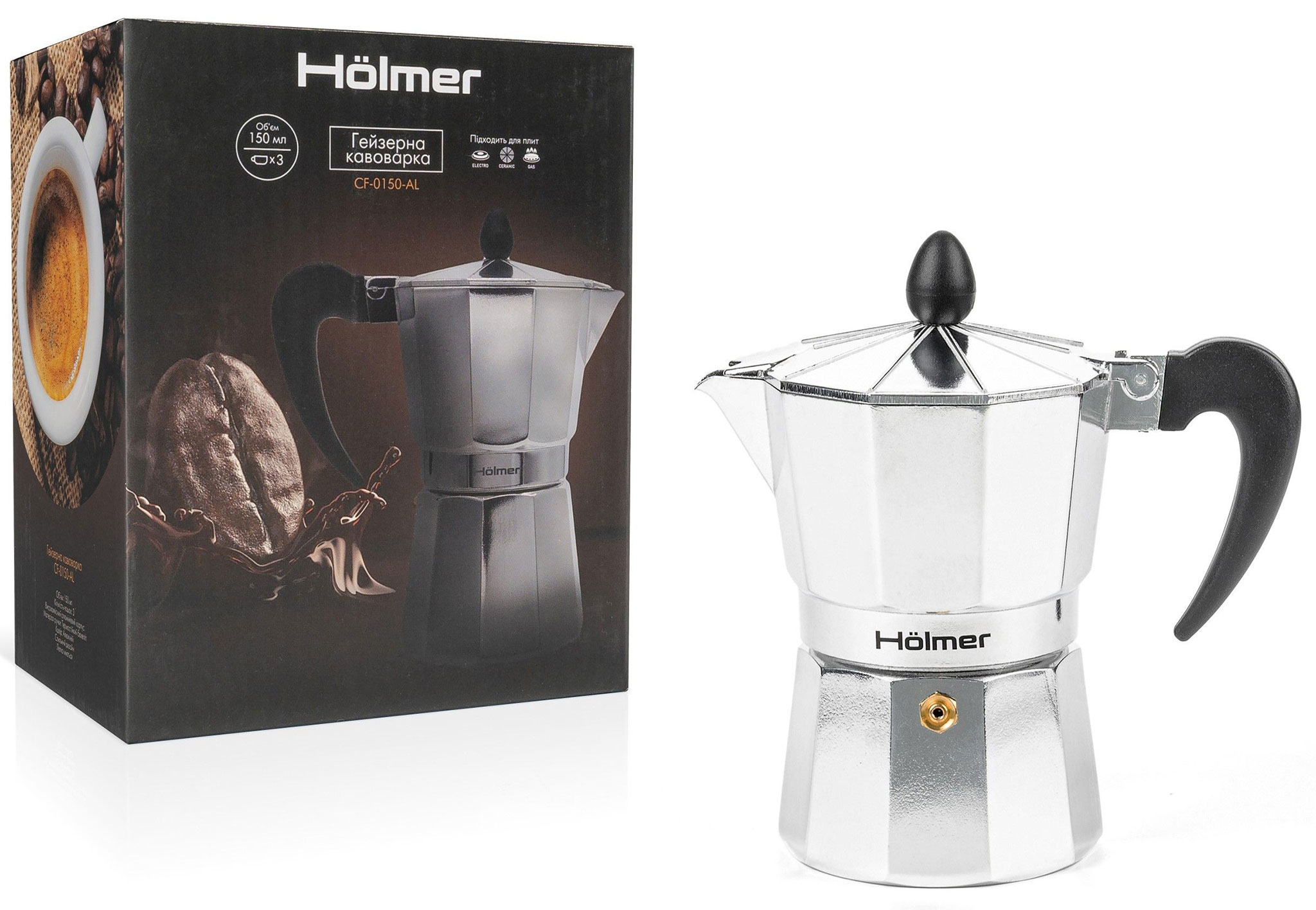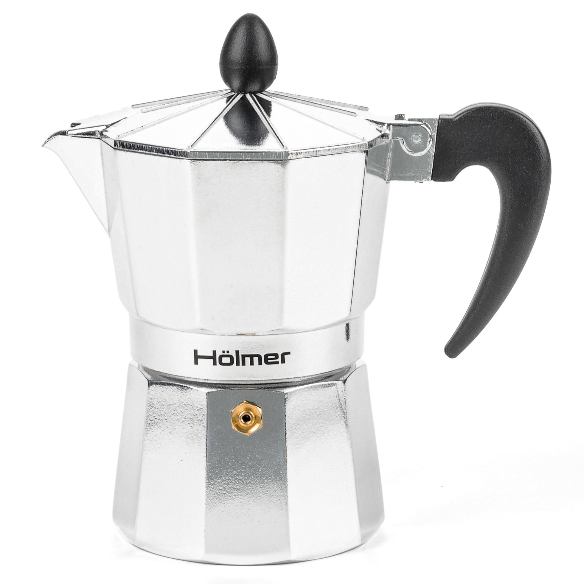 Сучасна гейзерна кавоварка Hölmer зроблена з високоякісного алюмінію, має зручну бакелітову ручку, яка не нагрівається. Кавоварка складається з двох ємностей, розділених спеціальним фільтром.