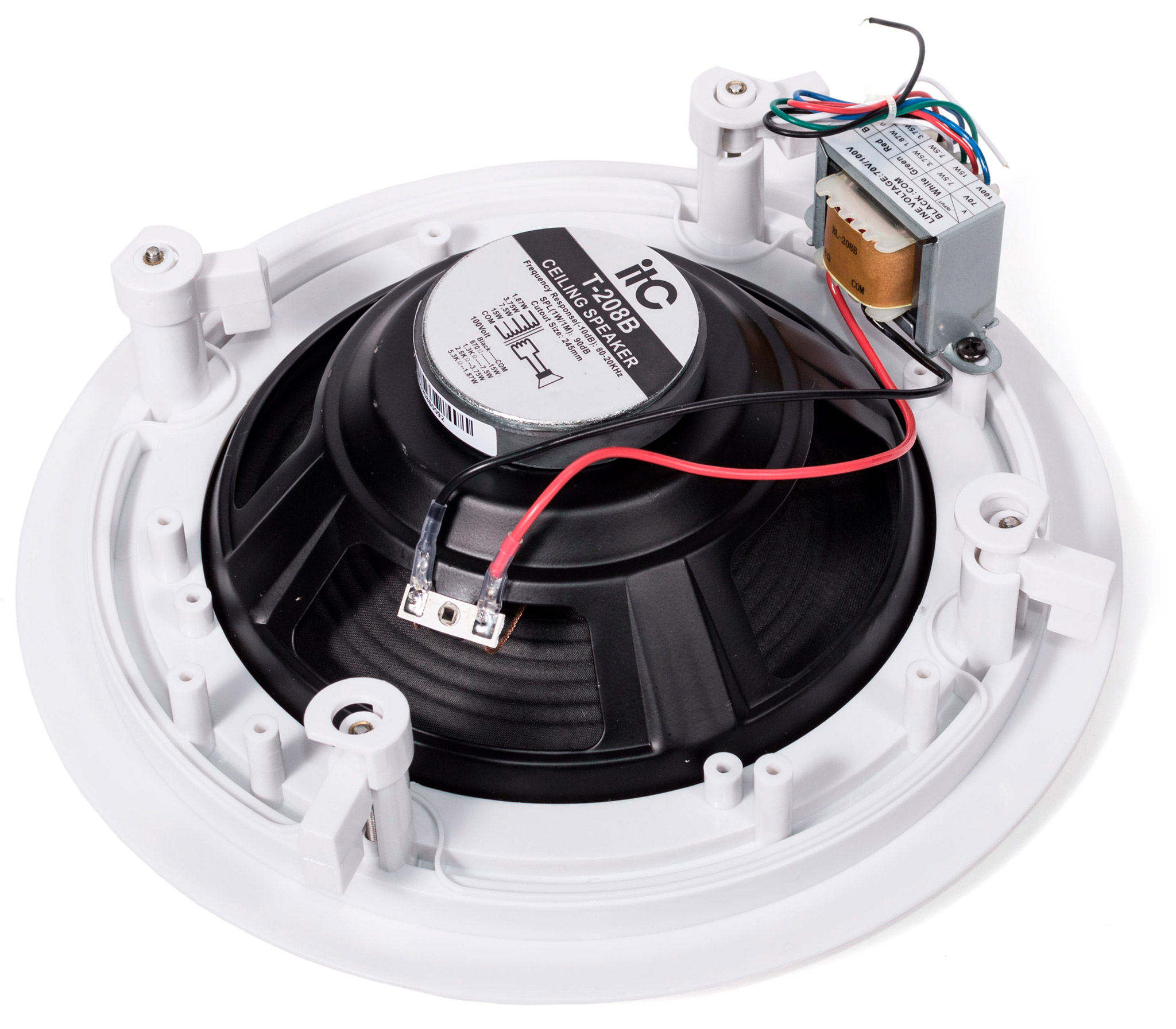T-205B - це стельовий гучномовець з вбудованим трансформатором 70/100 В. Застосування трансформатора 70/100 В знижує втрати в лінії на великих відстанях і дозволяє підключати велику кількість гучномовців паралельним з'єднанням.