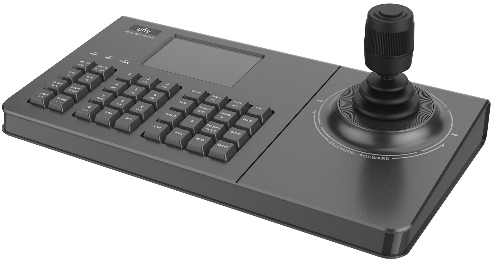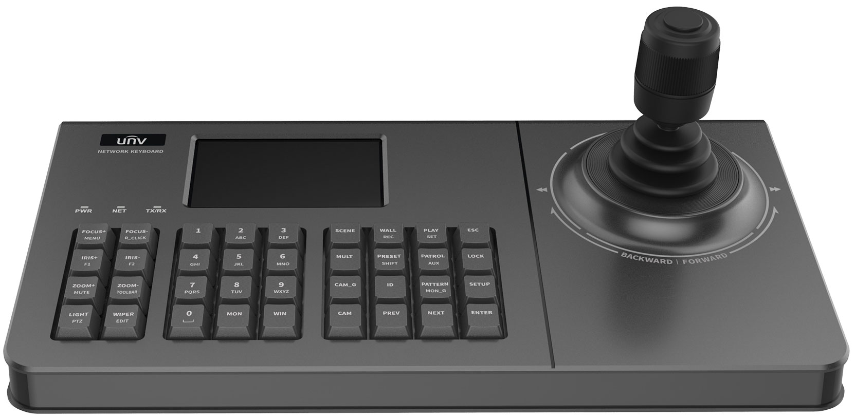 Вбудований 4-дюймовий екран відображає чітке та деталізоване зображення, що дозволяє швидко контролювати стан системи та вибрані відеоканали. 4D-джойстик з підтримкою рухів, фокусу та зуму забезпечує плавне й точне керування PTZ-камерами, а використання надійного джойстика Hoare підвищує стабільність роботи та зменшує зношування механізмів.