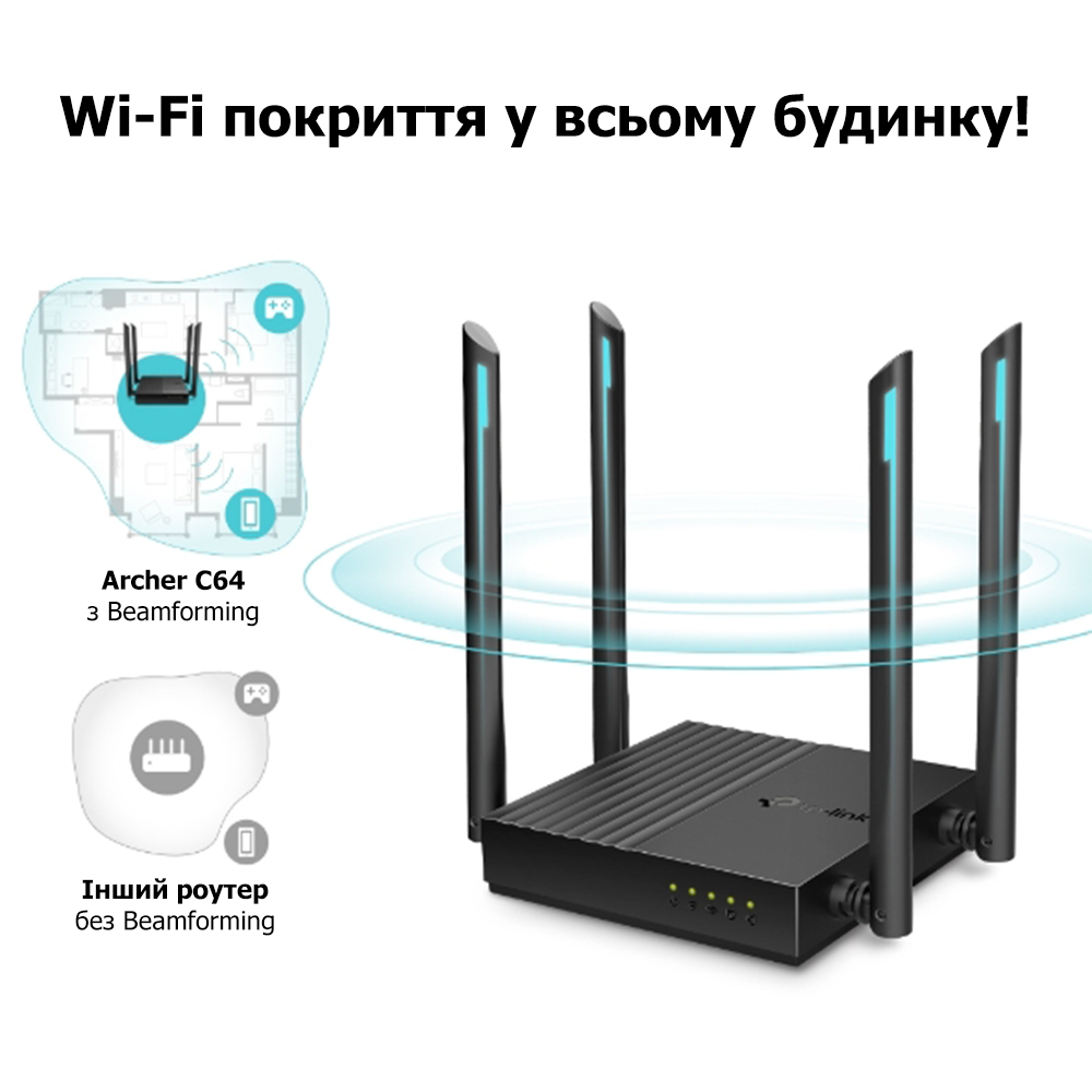 Archer C64 це двохдіапазонний роутер з підтримкою стандарту 802.11ac Wave 2. З'єднання Wi-Fi мереж він забезпечує зі швидкістю до 867 Мбіт / с в діапазоні 5 ГГц і до 300 Мбіт / с в діапазоні 2.4 ГГц.