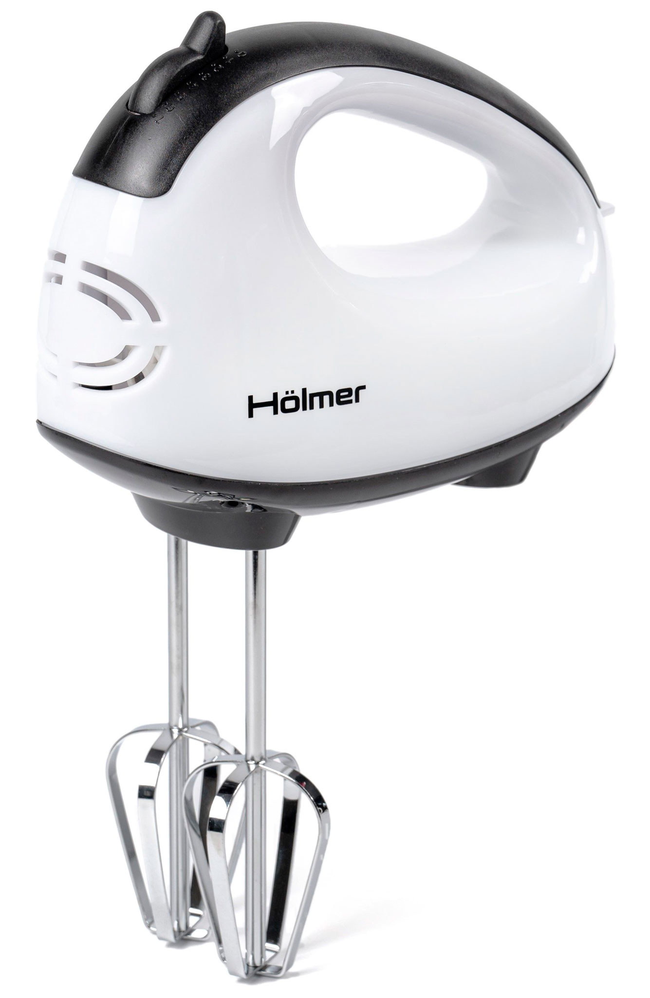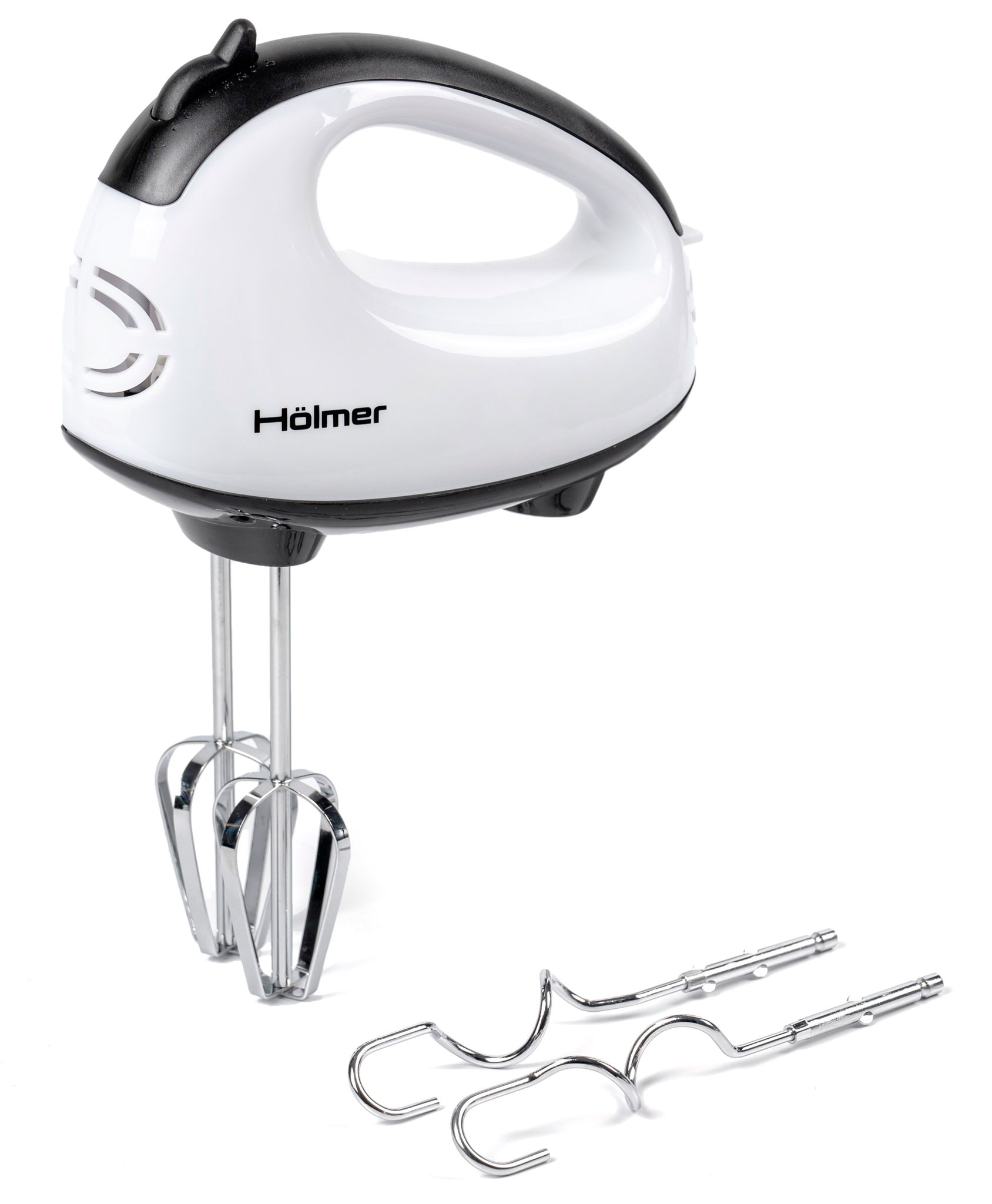 Сучасна модель Hölmer HHM-14 обтічної форми без гострих кутів представлена в класичному білому кольорі. Корпус виготовлений з якісного зносостійкого пластику, з хромованої сталі – потужні вінчики для збивання та гаки для тіста.