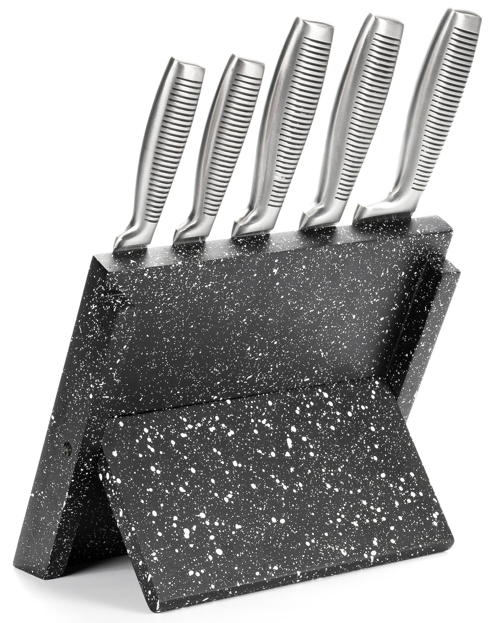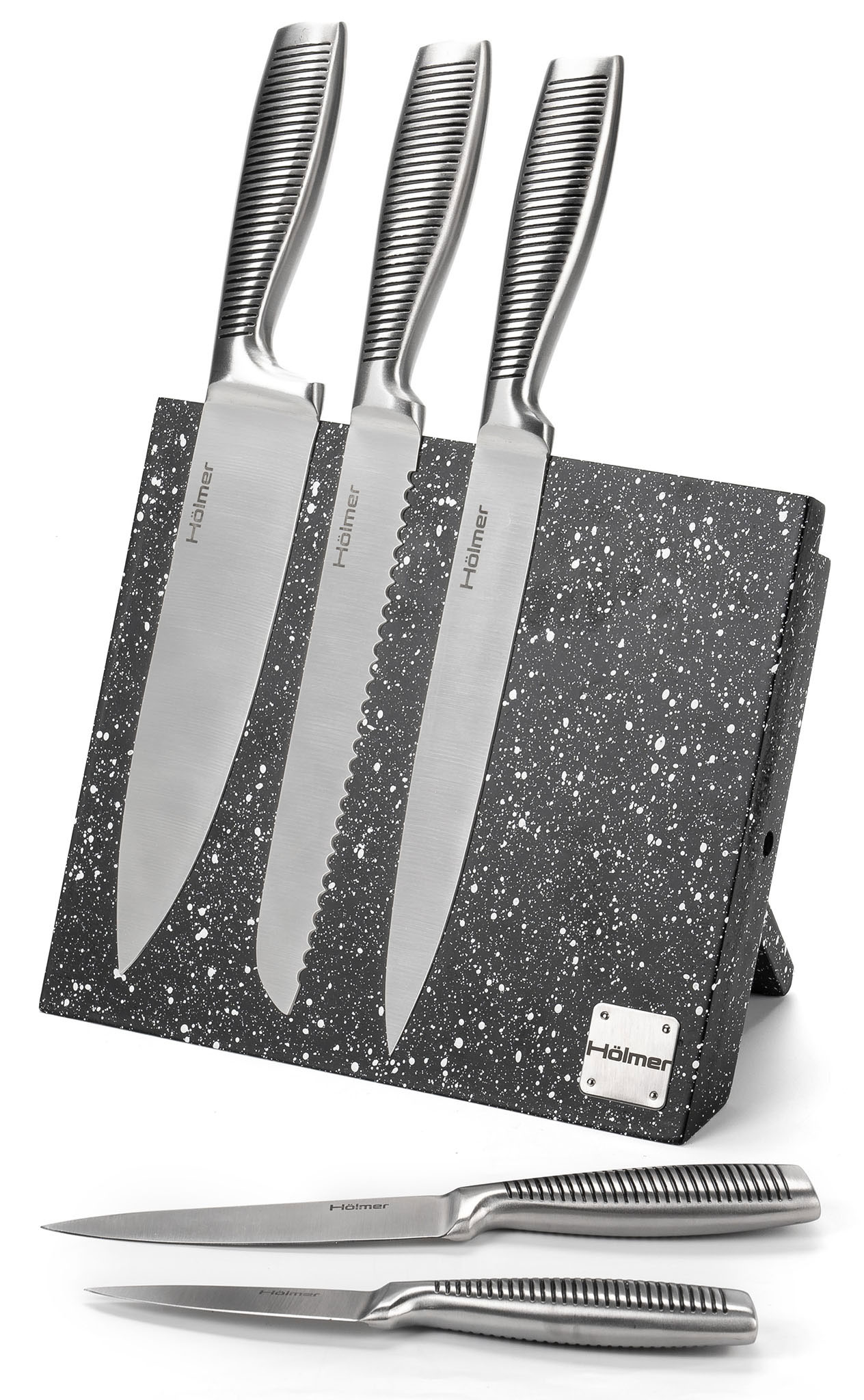 Набір ножів Hölmer KS-66225-MSSSS Stone складається з 6 предметів — п'яти ножів різного призначення з лезами з високоякісної нержавіючої сталі, які стануть ідеальним варіантом для нарізування різноманітних продуктів на вашій кухні, а також підставки з вбудованою магнітною планкою.