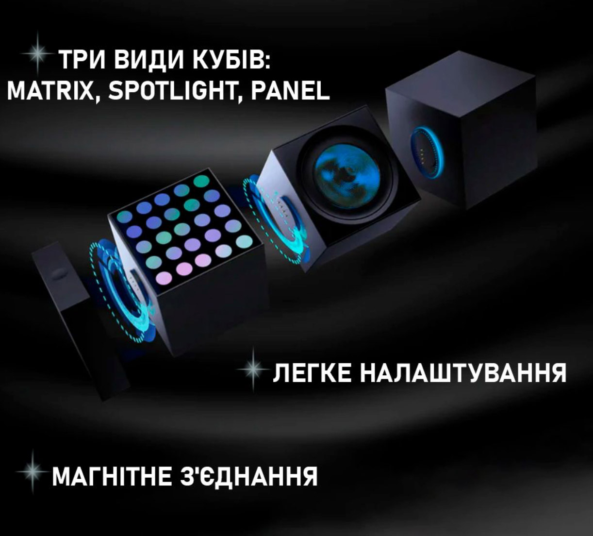 Ви можете відображати кольори, анімації, символи чи навіть графіку — він перетворює простір на динамічне світлове полотно. Підтримує Wi-Fi-керування, інтеграцію із системами «розумного дому» та дозволяє будувати композиції із кількох кубів для масштабного ефекту.