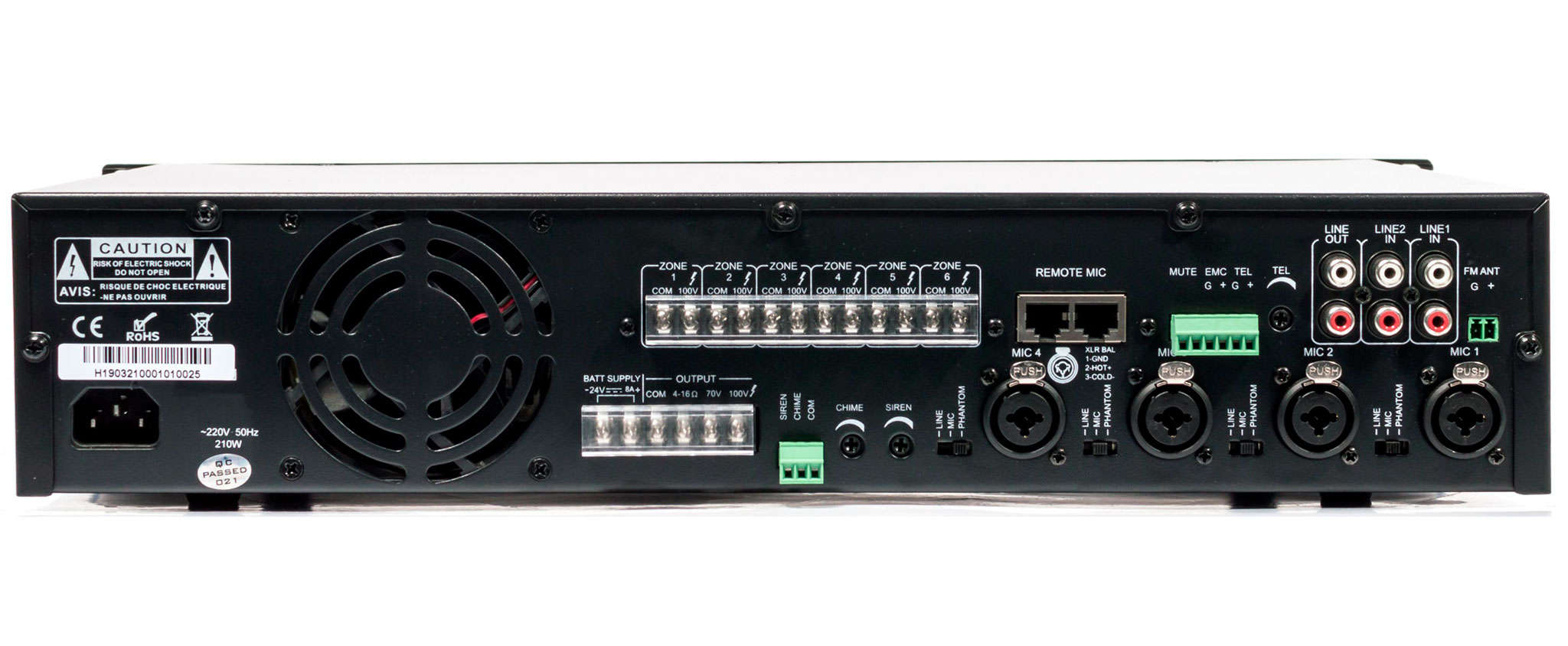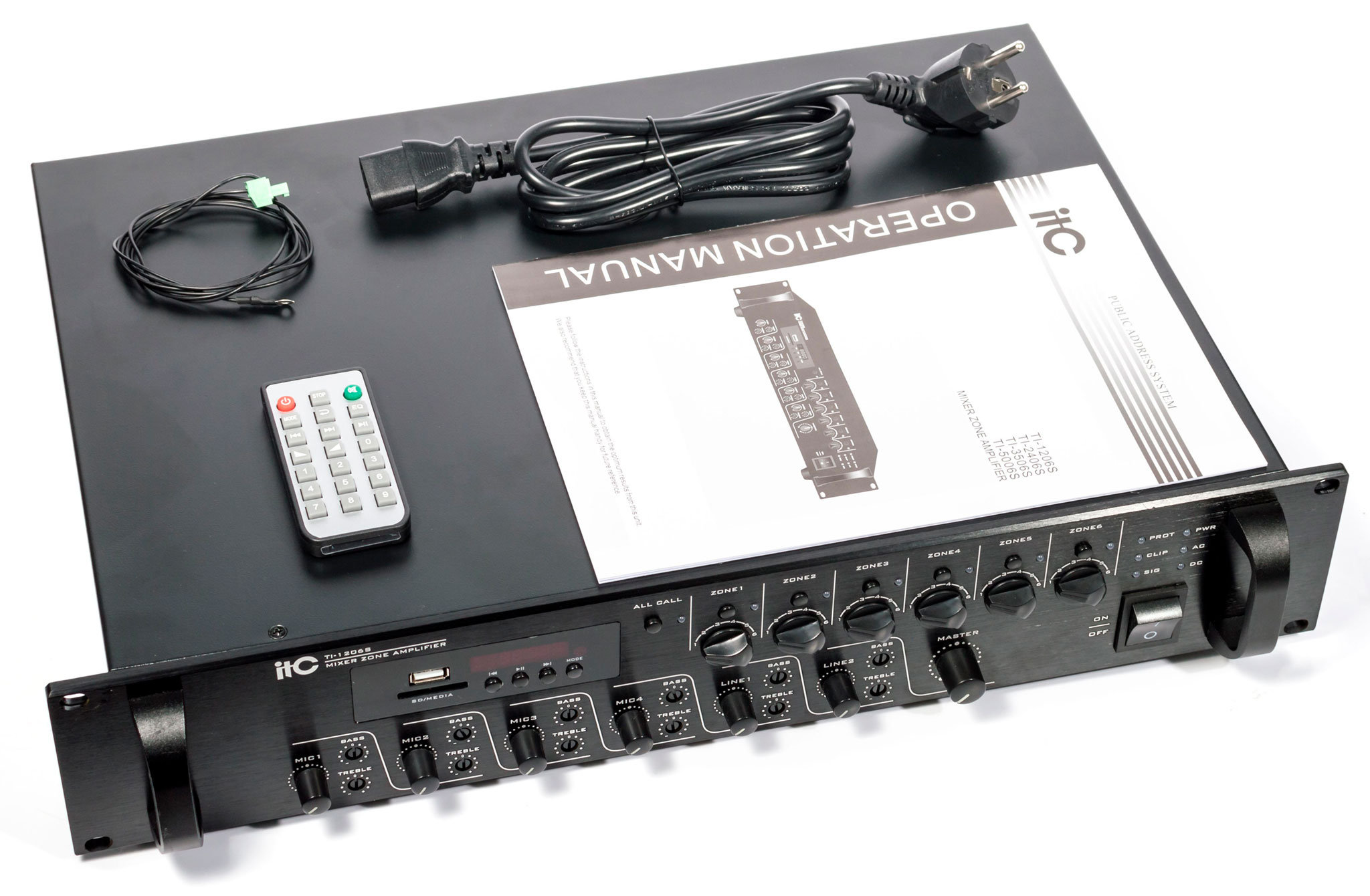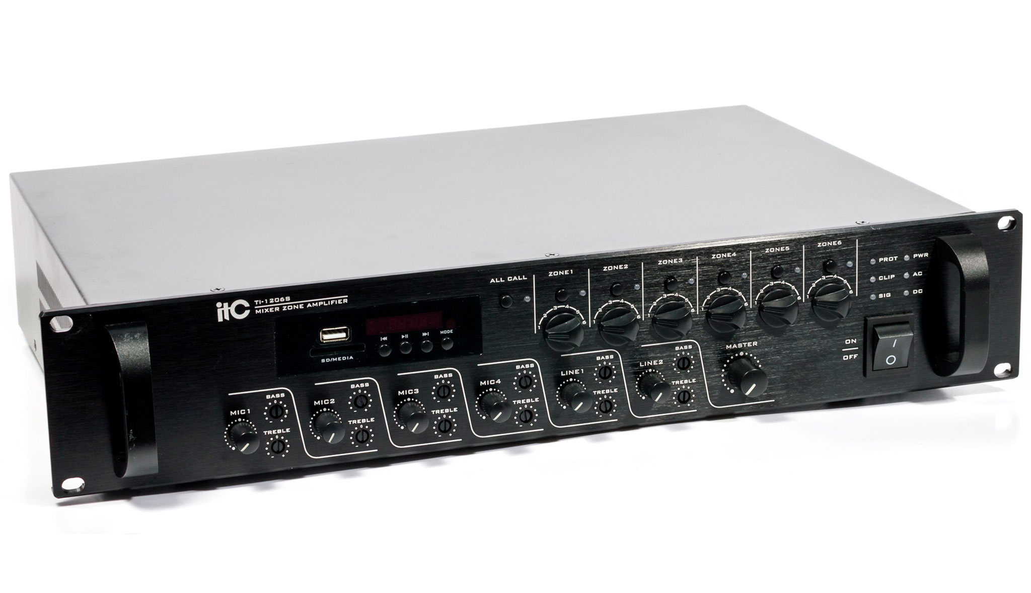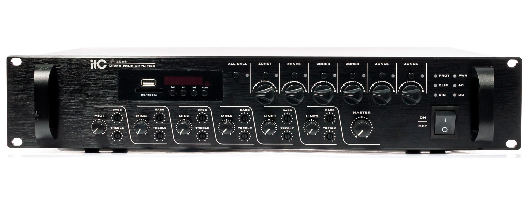 Мікшуючий багатозонний підсилювач потужності з вбудованим плеєром для відтворення файлів з USB накопичувача або SD карти, FM тюнер і функція Bluetooth. Ідеальне рішення для трансляції фонової музики і повідомлень на об'єктах з декількома приміщеннями або зонами трансляції де потрібно роздільне регулювання гучності, таких як торгові і розважальні центри, готелі, офіси, школи і ВНЗ, магазини і супермаркети, ресторани, ландшафтні парки і т.д.