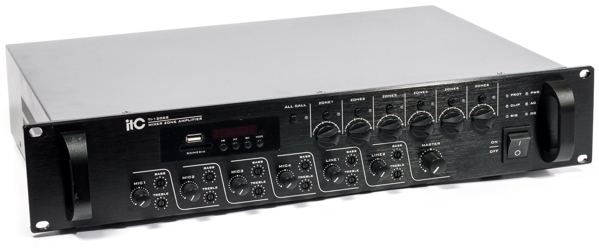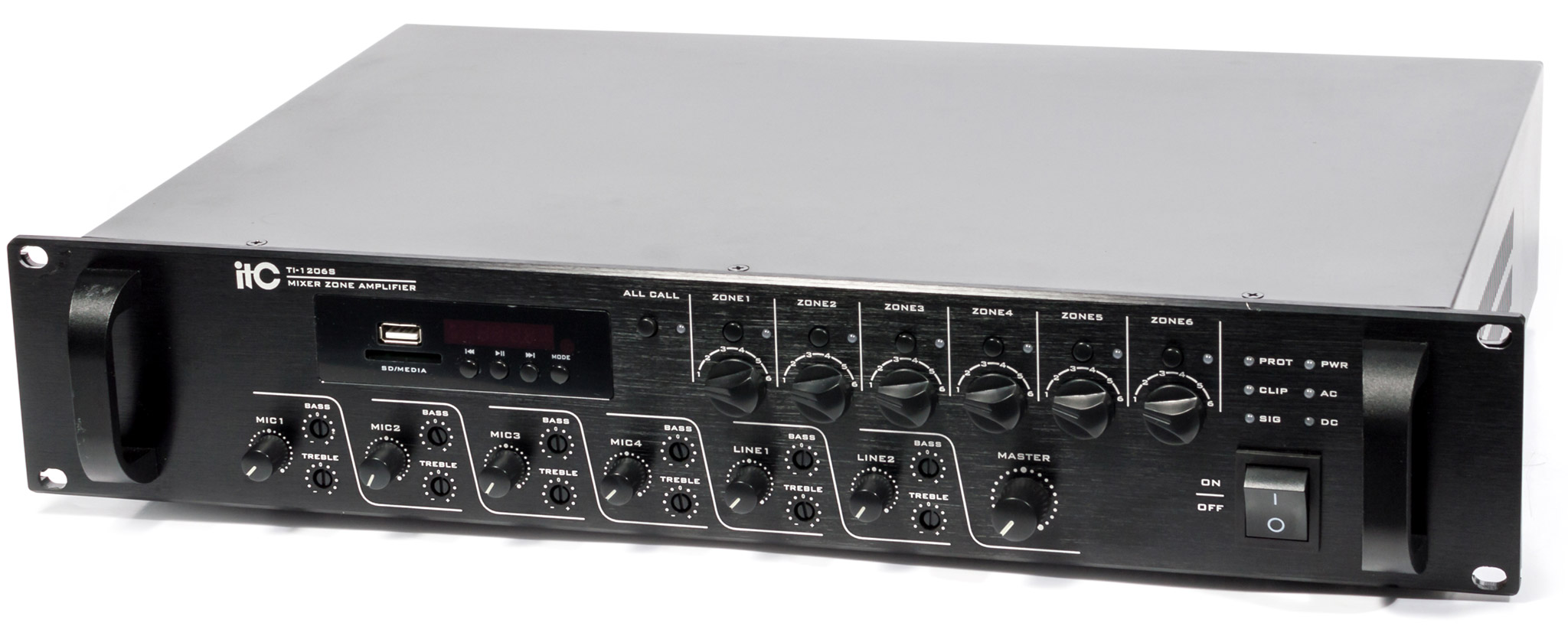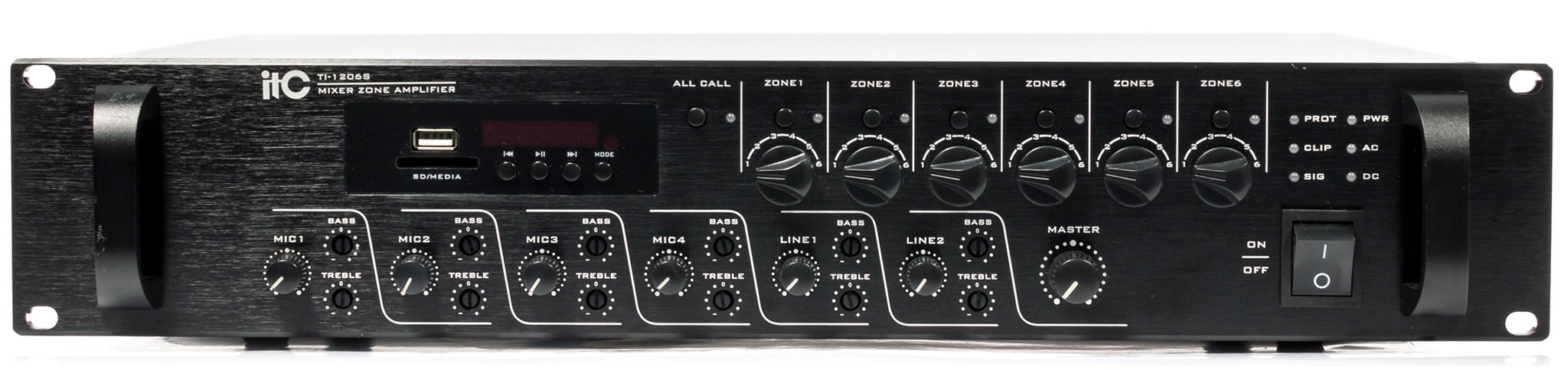 Мікшуючий багатозонний підсилювач потужності з вбудованим плеєром для відтворення файлів з USB накопичувача або SD карти, FM тюнер і функція Bluetooth. Ідеальне рішення для трансляції фонової музики і повідомлень на об'єктах з декількома приміщеннями або зонами трансляції де потрібно роздільне регулювання гучності, таких як торгові і розважальні центри, готелі, офіси, школи і ВНЗ, магазини і супермаркети, ресторани, ландшафтні парки і т.д.