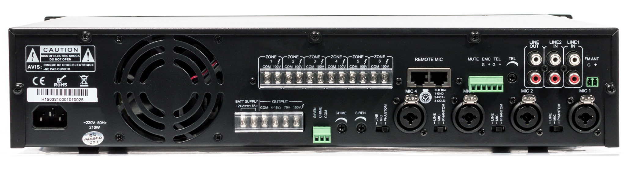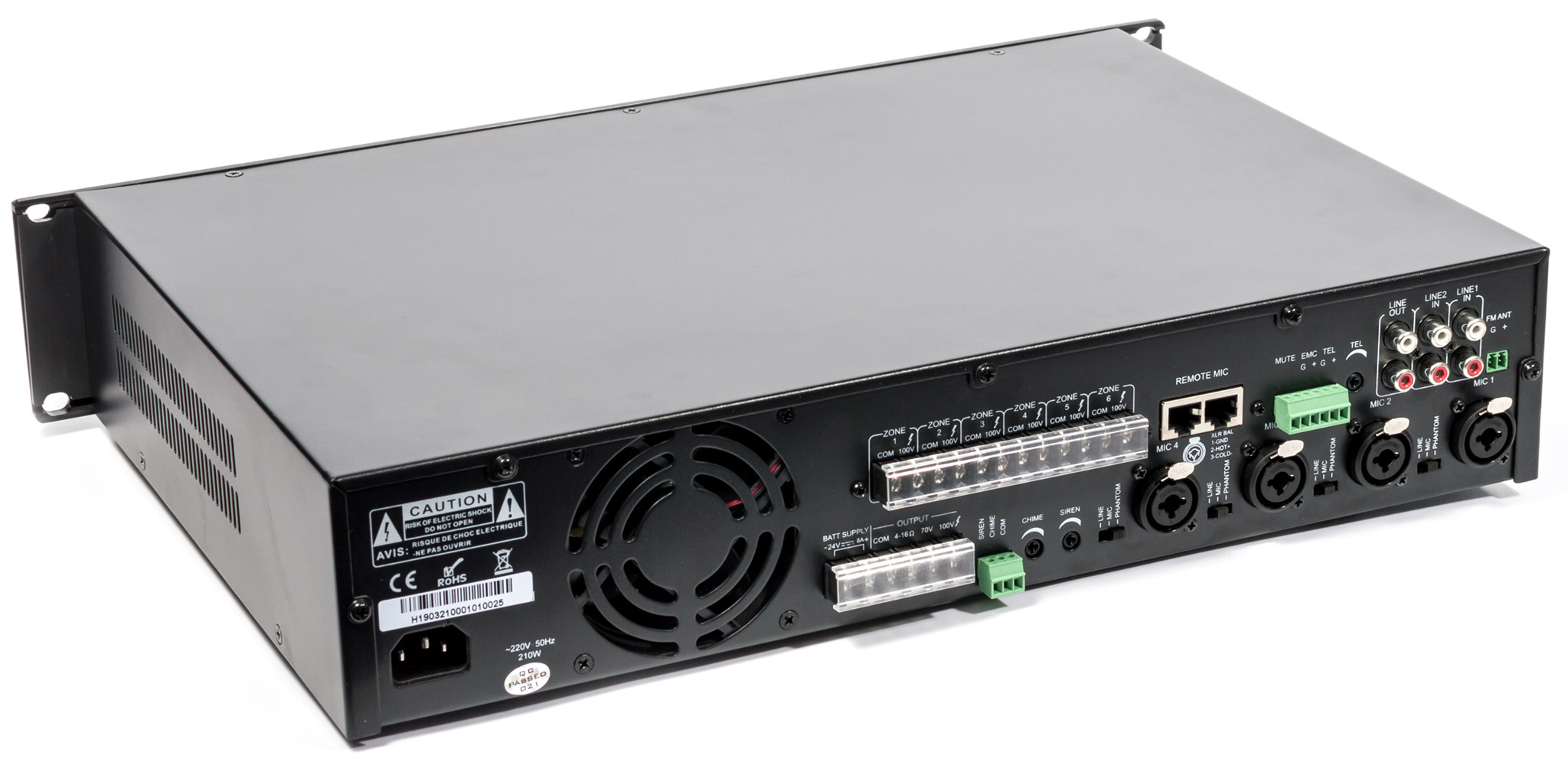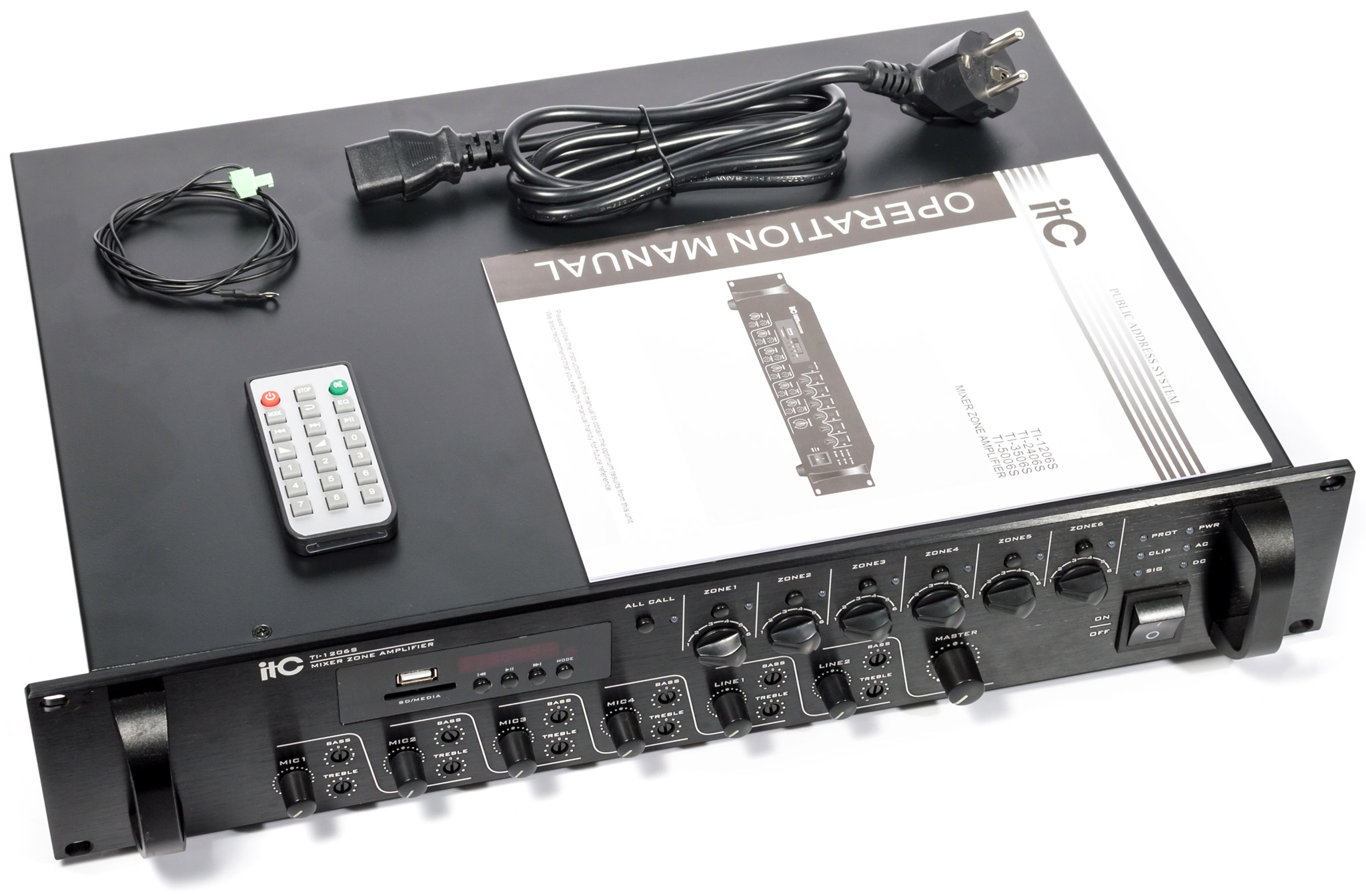 Мікшуючий багатозонний підсилювач потужності з вбудованим плеєром для відтворення файлів з USB накопичувача або SD карти, FM тюнер і функція Bluetooth. Ідеальне рішення для трансляції фонової музики і повідомлень на об'єктах з декількома приміщеннями або зонами трансляції де потрібно роздільне регулювання гучності, таких як торгові і розважальні центри, готелі, офіси, школи і ВНЗ, магазини і супермаркети, ресторани, ландшафтні парки і т.д.