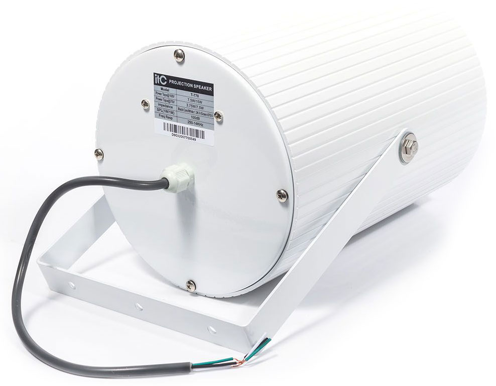 T-770 - это водонепроницаемый проекционный динамик со встроенным трансформатором 70 В/100 В. Трансформатор 70 В/100 В снижает потери в линии на большем расстоянии и позволяет легко подключать несколько громкоговорителей параллельно.