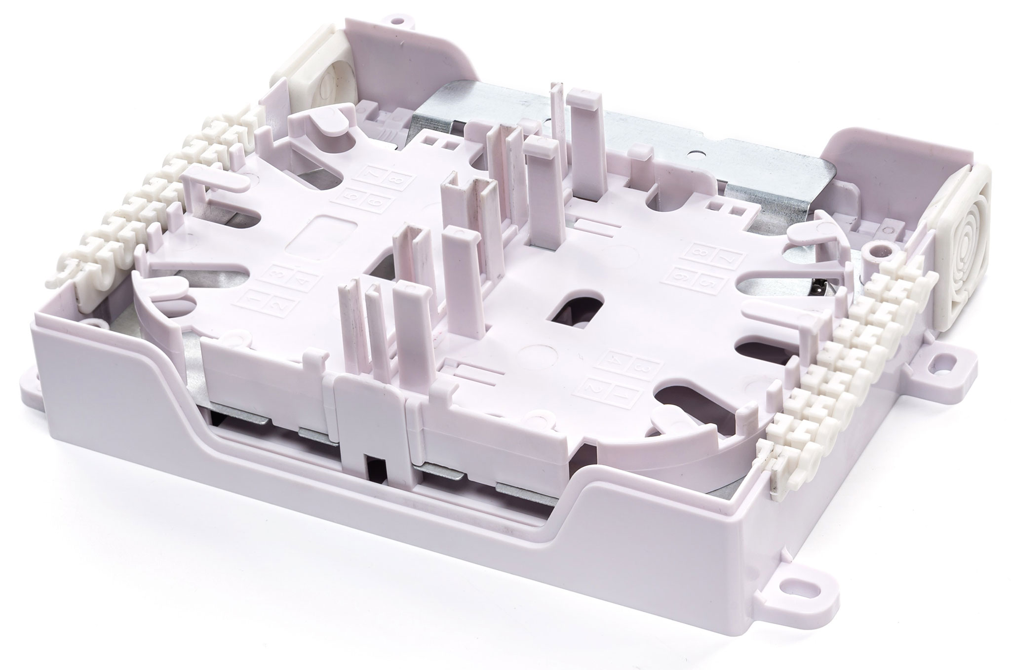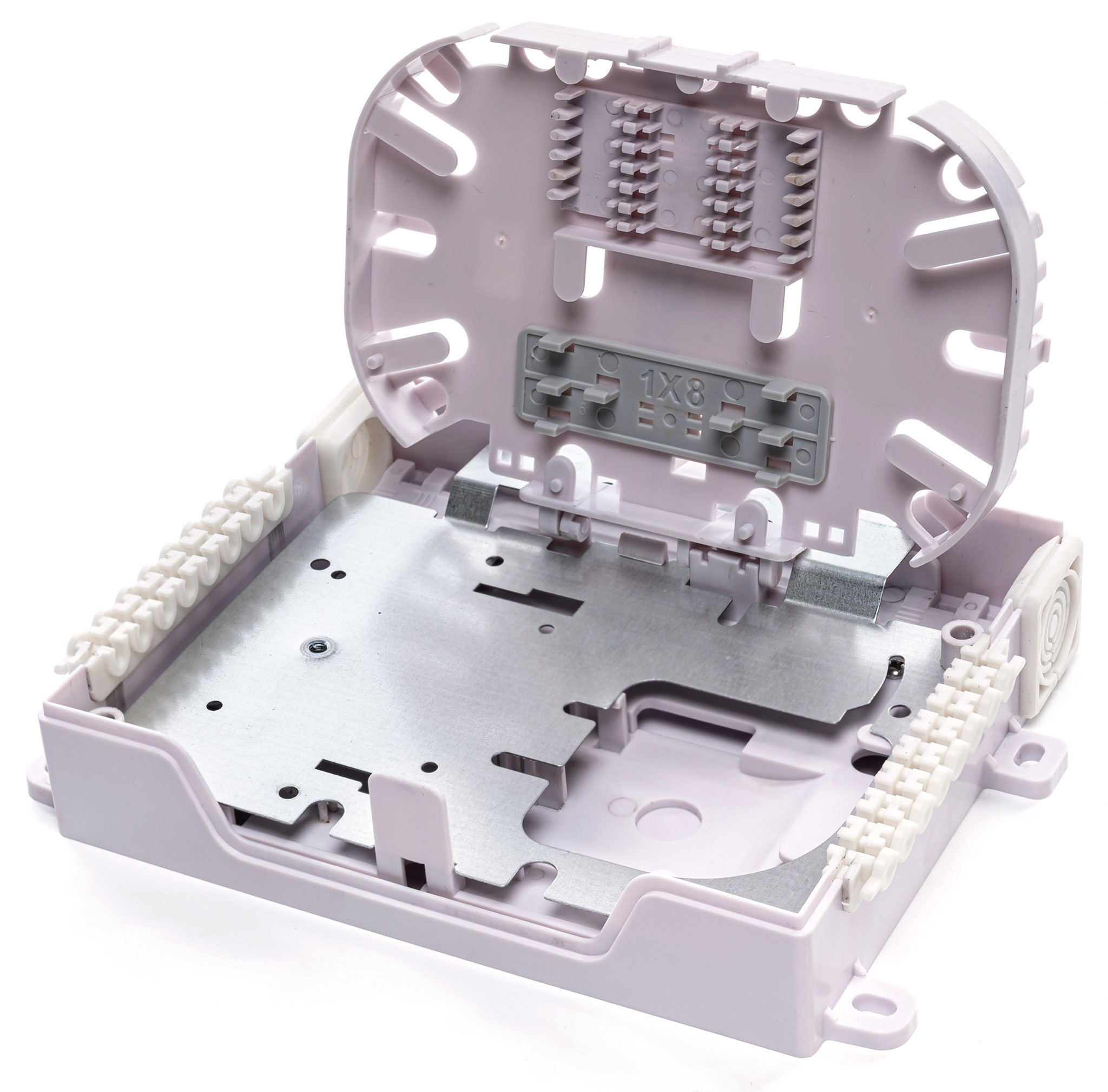 Всередині корпуса знаходиться вставка, на якій розміщується запас волокон пігтейлів, ложементи для КДЗС і оптичні адаптери для підключення вхідних роз'ємів сплітерних модулів. Зона монтажа ОВ закривається металевою кришкою, до якої можуть кріпитись сплітерні USM - модулі 1х4 або 1х8.