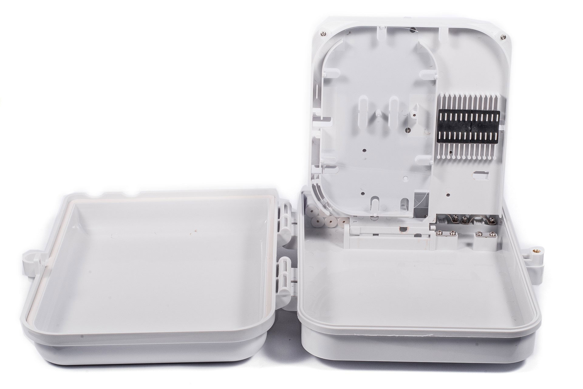 Двусторонняя откидная сплайс-кассета ном. емкостью 12 волокон (Макс 24) для заключения гильз и запаса оптических волокон. Есть возможность установки механических соединителей волокон.