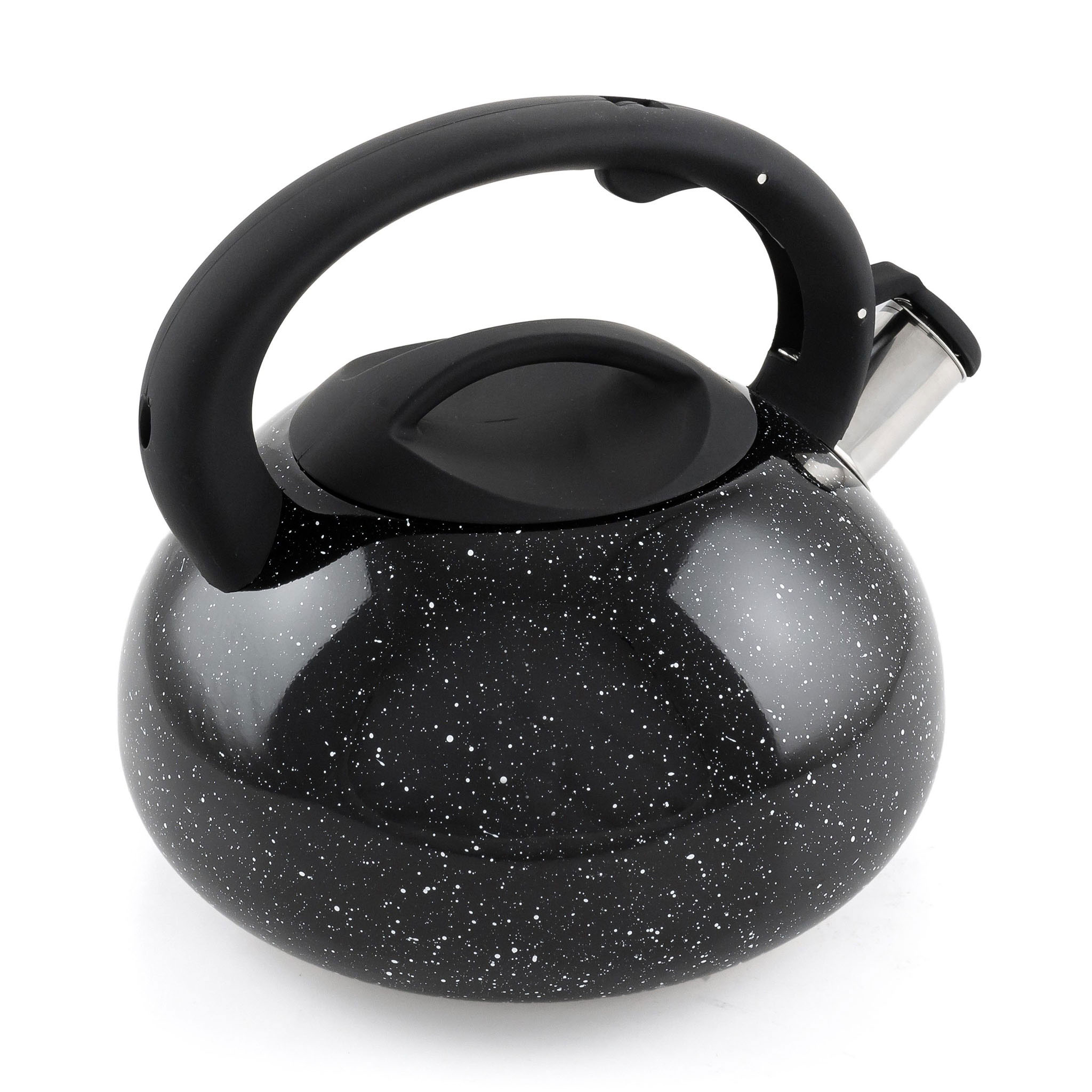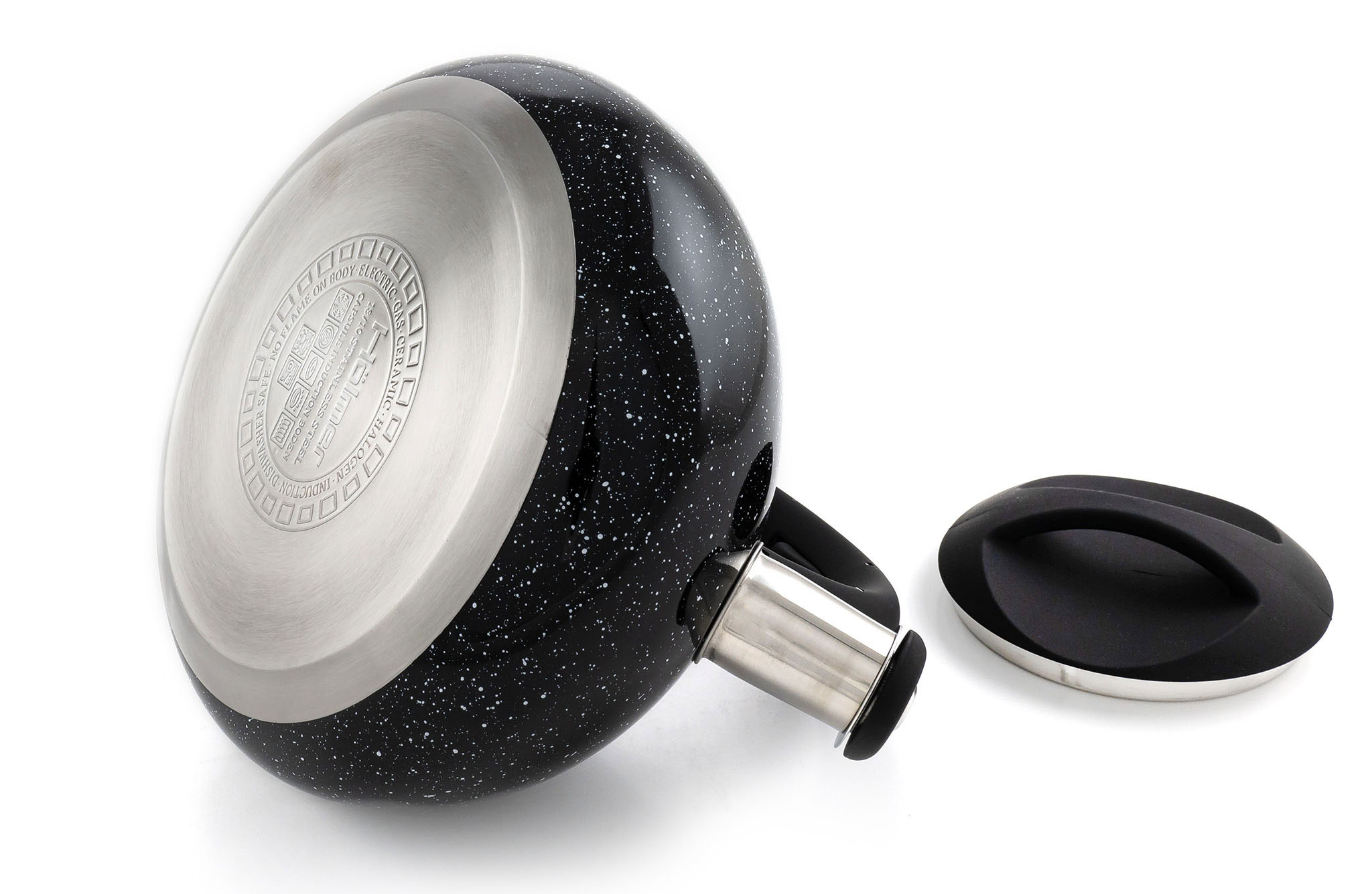 Для безпечного та зручного користування, чайник отримав термостійкі бакелітові ручки чорного кольору з SOFT-Touch покриттям та кнопкою відкриття носика. Корпус свистка також виконано з бакеліту, який захистить від випадкових опіків під час використання.