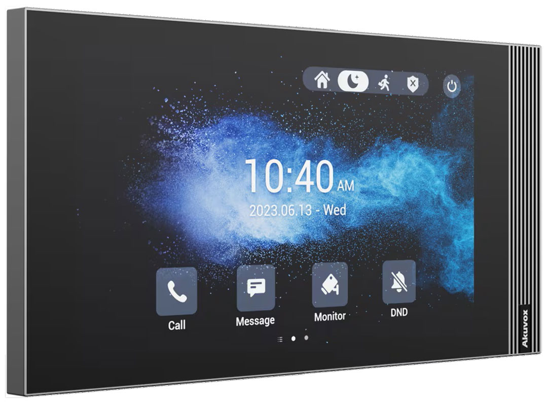 Домофон обладнаний 10-дюймовим сенсорним IPS LCD-дисплеєм зі співвідношенням сторін 16:10 та роздільною здатністю 1280×800. Екран характеризується контрастністю 900:1, яскравістю 290 кд/м² і широкими кутами огляду 80° в усіх напрямках, що забезпечує чітке та стабільне зображення. Проекційний ємнісний сенсор гарантує високу точність керування, а режими відображення звичайний чорний і прозорий дозволяють адаптувати інтерфейс до інтер’єру.