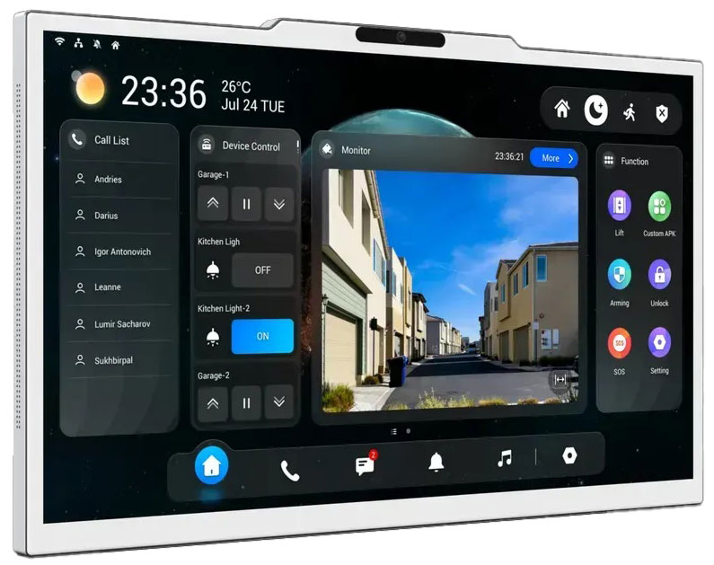 Апаратна платформа побудована на базі операційної системи Android 14, що значно розширює функціональність пристрою та дозволяє використовувати сторонні додатки. Високу продуктивність забезпечує конфігурація з 8 ГБ оперативної пам’яті та 32 ГБ вбудованої пам’яті, яка дозволяє стабільно обробляти відеопотоки, аудіозв’язок, інтерфейс користувача та інтеграційні сценарії без затримок. Домофон оснащений двома адаптивними Ethernet-портами RJ45 10/100 Мбіт/с, а також підтримує Wi-Fi IEEE 802.11 b/g/n/ax (Wi-Fi 6) і Bluetooth 5.3 для бездротових підключень і взаємодії з периферією.