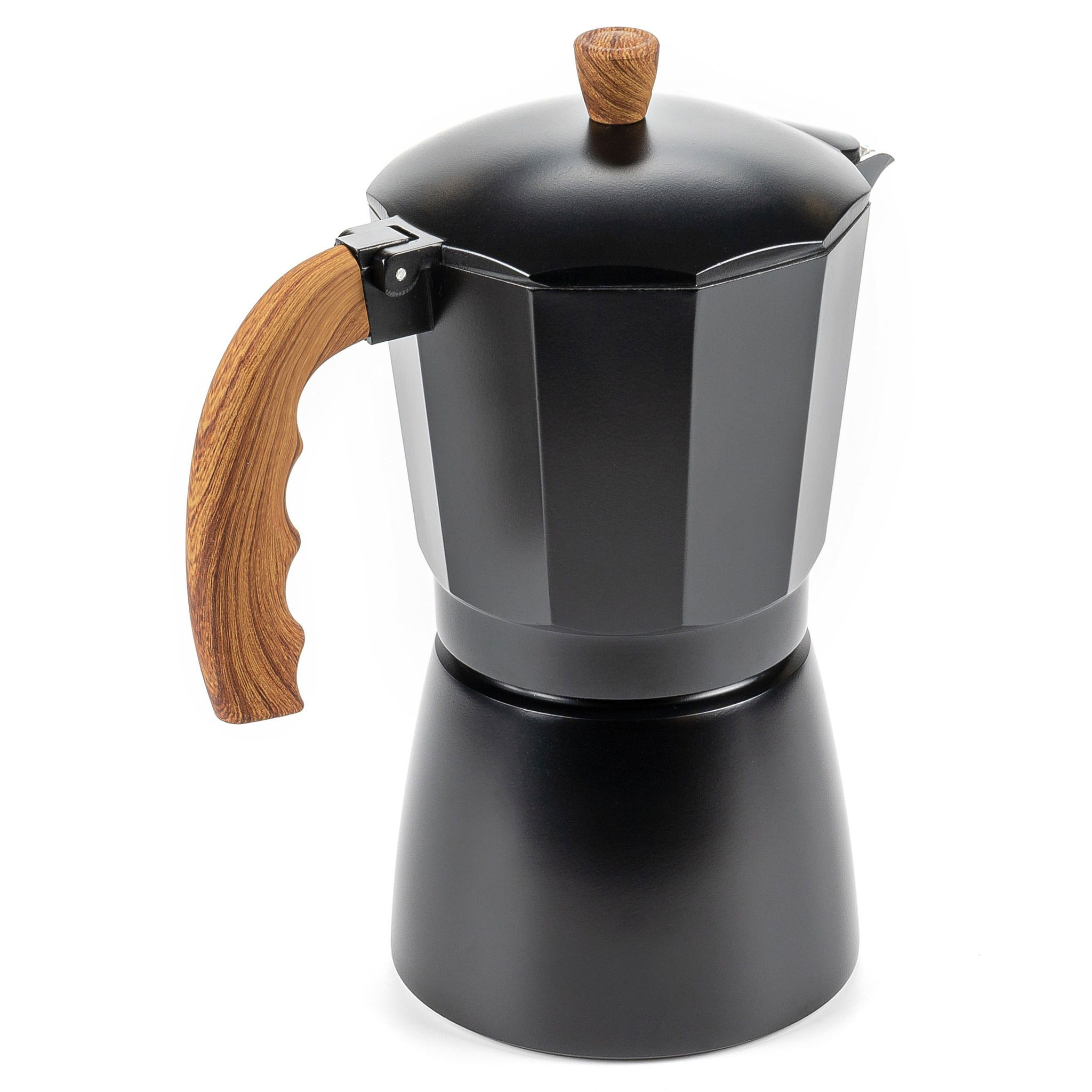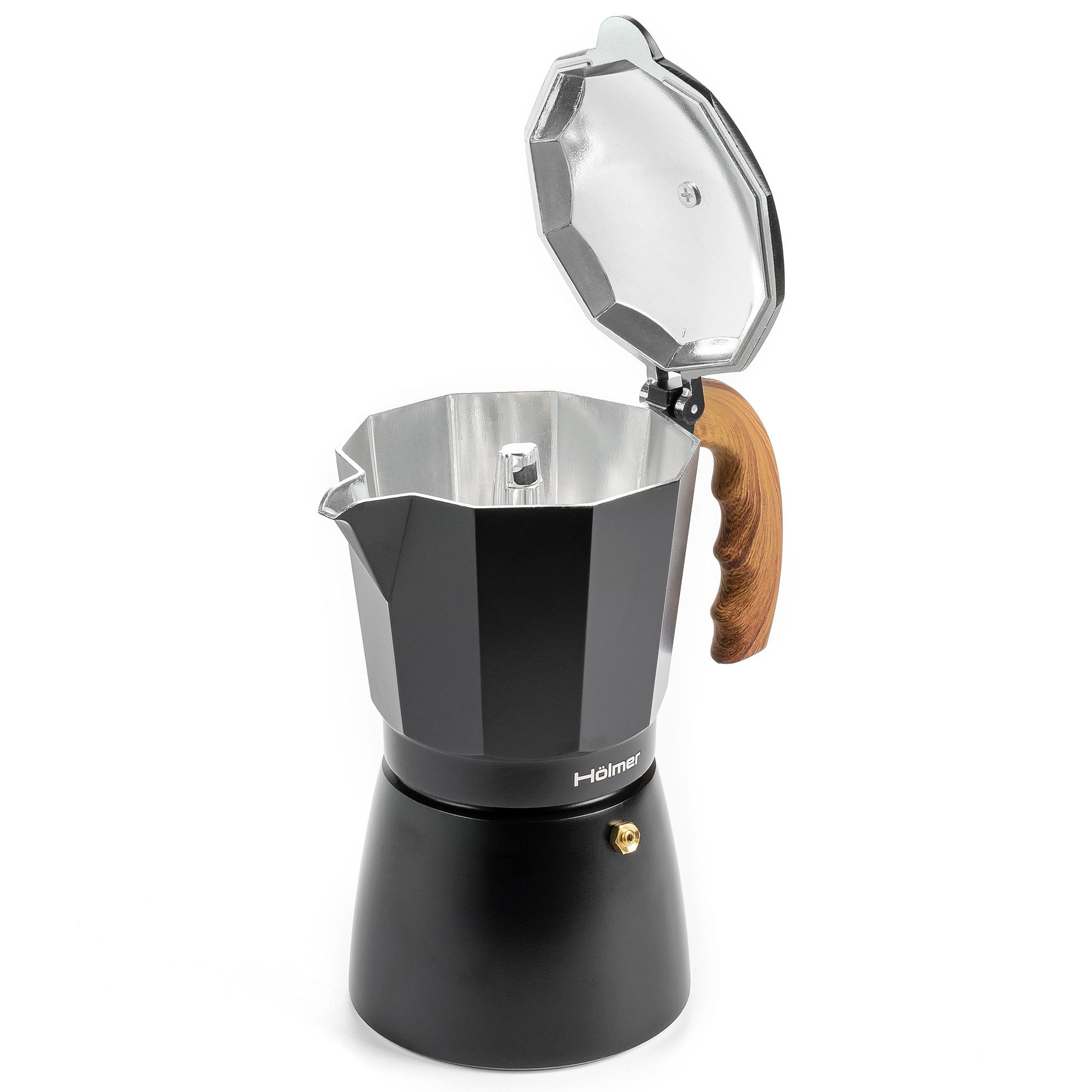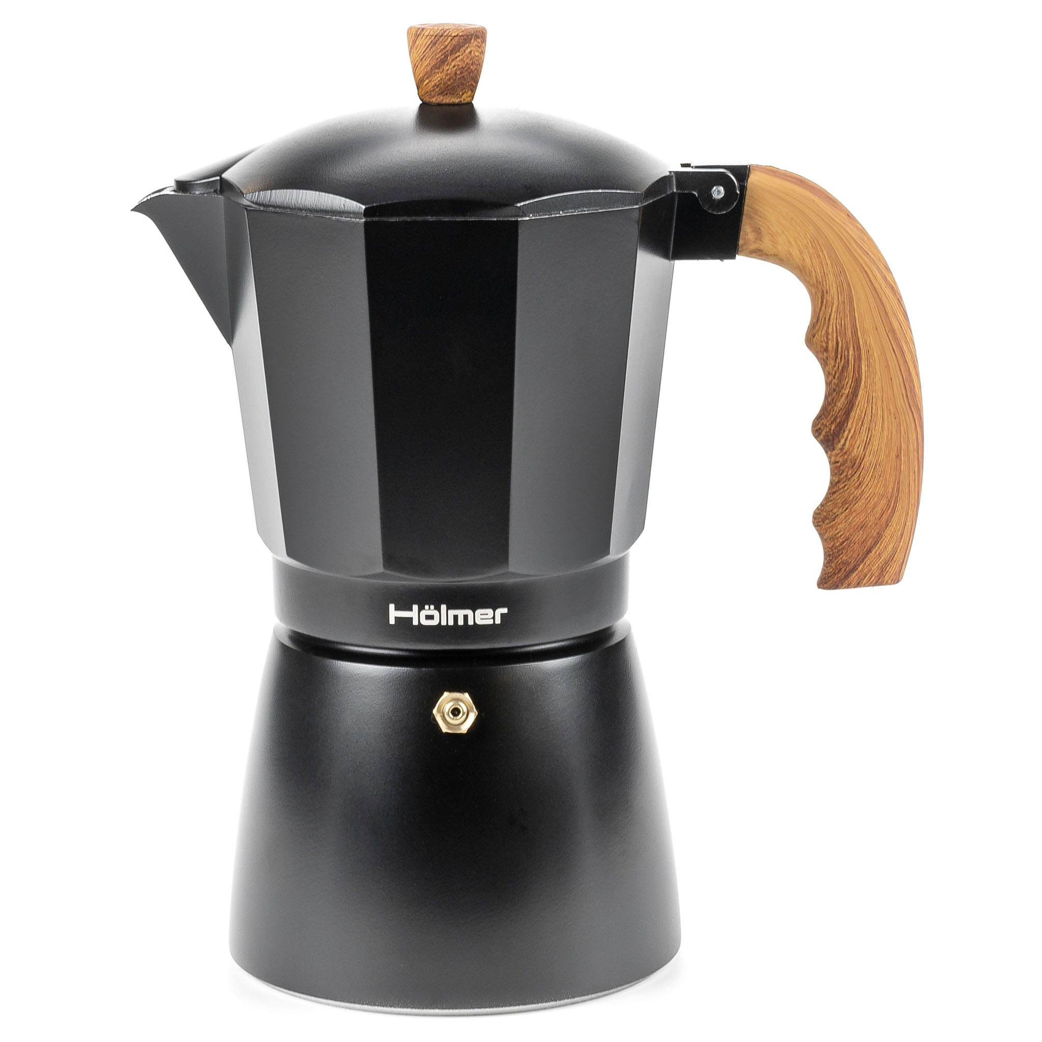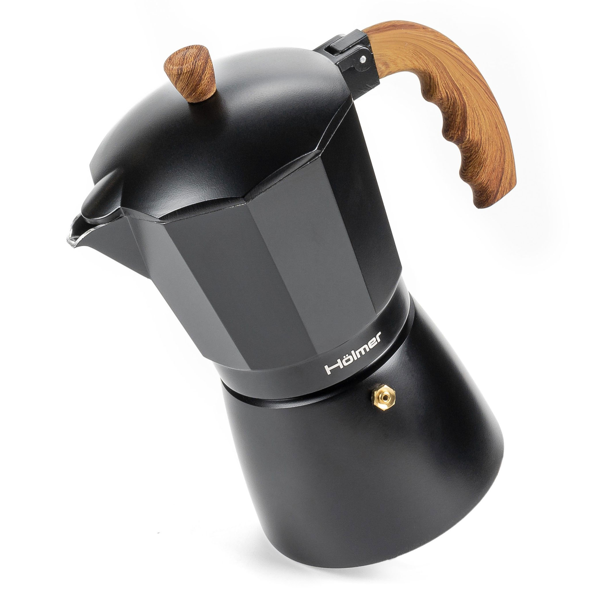Сучасна гейзерна кавоварка Hölmer зроблена з високоякісного алюмінію, має чорний колір, зручну бакелітову ручку, яка не нагрівається та стилізована під дерево. Кавоварка складається з двох ємностей, розділених спеціальним фільтром.