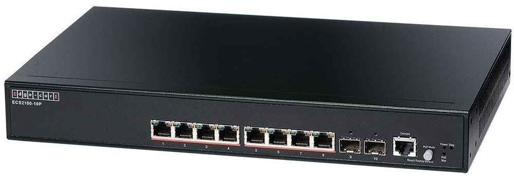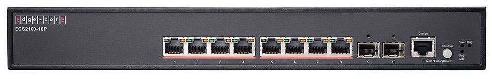 ECS2100-10P это full-PoE fanless коммутатор, который поддерживает 15,4 W на 8 портов либо 30 W на 4 порта, что обеспечивает растущие потребности в мощности.