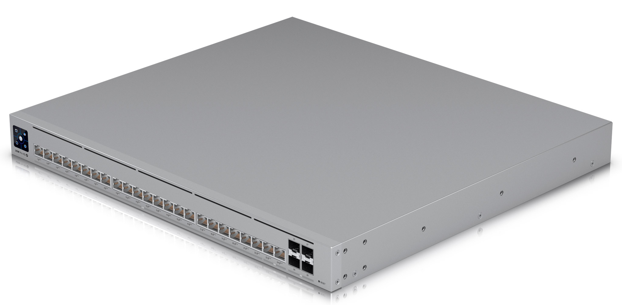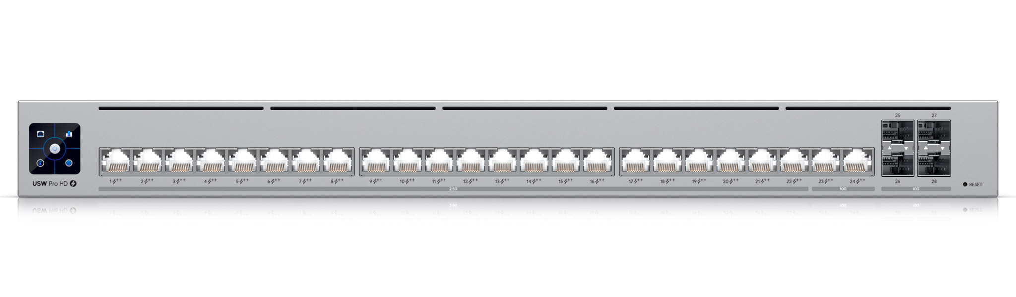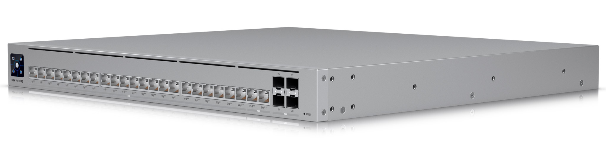 Для зручності адміністрування та надійності USW-PRO-HD-24-POE оснащений 1.3-дюймовим сенсорним дисплеєм для моніторингу в реальному часі та інноваційною системою Etherlighting™, що підсвічує порти для швидкої ідентифікації підключень. Пристрій виконаний у металевому корпусі форм-фактора 1U для монтажу в стійку та підтримує підключення системи резервного живлення UniFi SmartPower (USP-RPS), що забезпечує безперервну роботу навіть у випадку збоїв в електромережі.