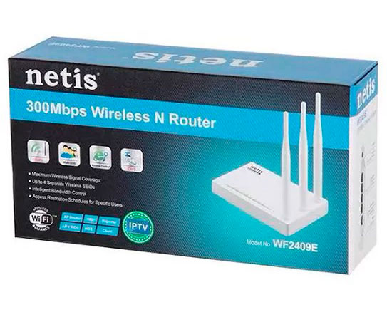 Маршрутизатор netis WF2409E забезпечить обмін даними зі швидкістю 300 Мбіт / с для ваших комп’ютерів, смартфонів, бездротових камер і інших пристроїв з підтримкою Wi-Fi. Три потужні антени з коефіцієнтом посилення 5 дБі розширюють зону покриття бездротової мережі і дозволяють Вам вільно підключатися до Інтернету у будь-якій точці будинку, створюючи ідеальні умови для швидкого завантаження файлів, сеансів інтернет-телефонії і перегляду потокового відео з високою роздільною здатністю.
