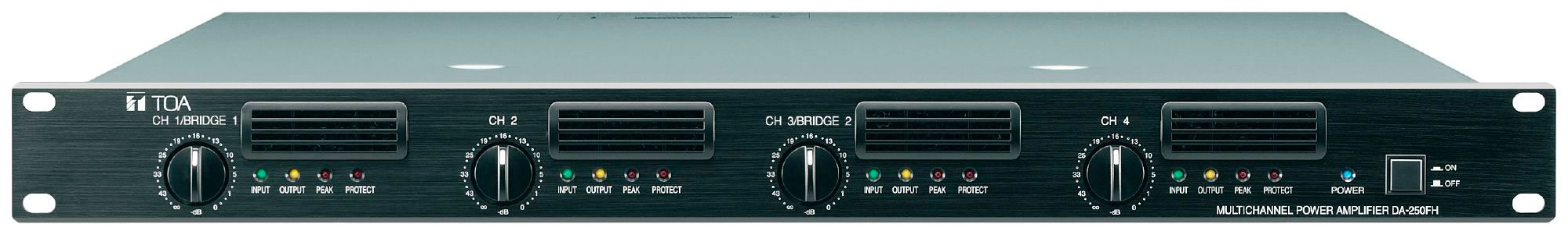 Модель TOA DA-250FH это цифровой усилитель мощности, сконструированный для высокоомных (100 В) систем озвучивания, обладающий малым весом, низкой теплоотдачей, высокой эффективностью при солидной выходной мощности (250 Вт на каждый из 4-х каналов).