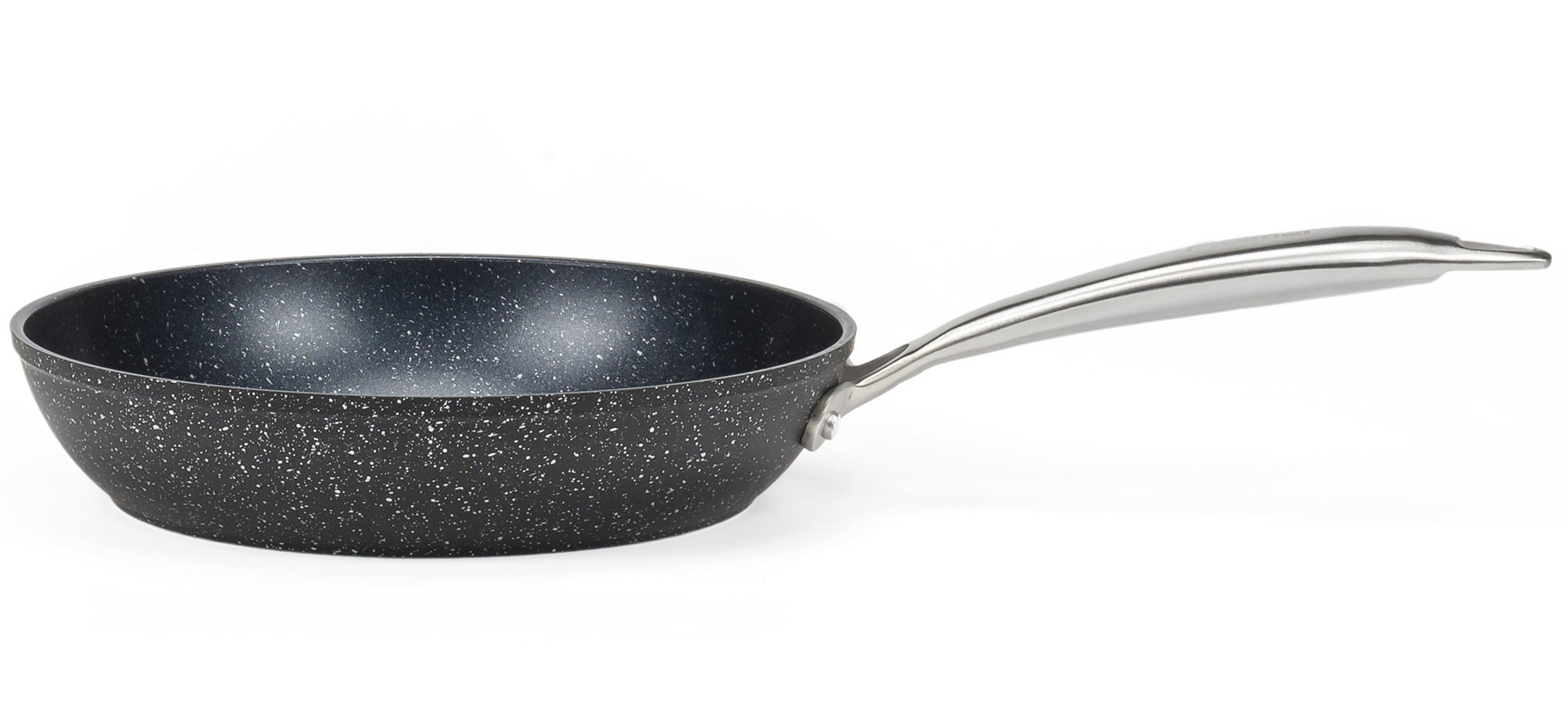 Сковороди серії Elegance виготовлені із кованого алюмінію, товщиною 3 мм, ця сковорідка нагрівається швидко та рівномірно. Що значно прискорює процес приготування, а також перешкоджає пригоранню і нерівномірному просмажуванню продуктів.
