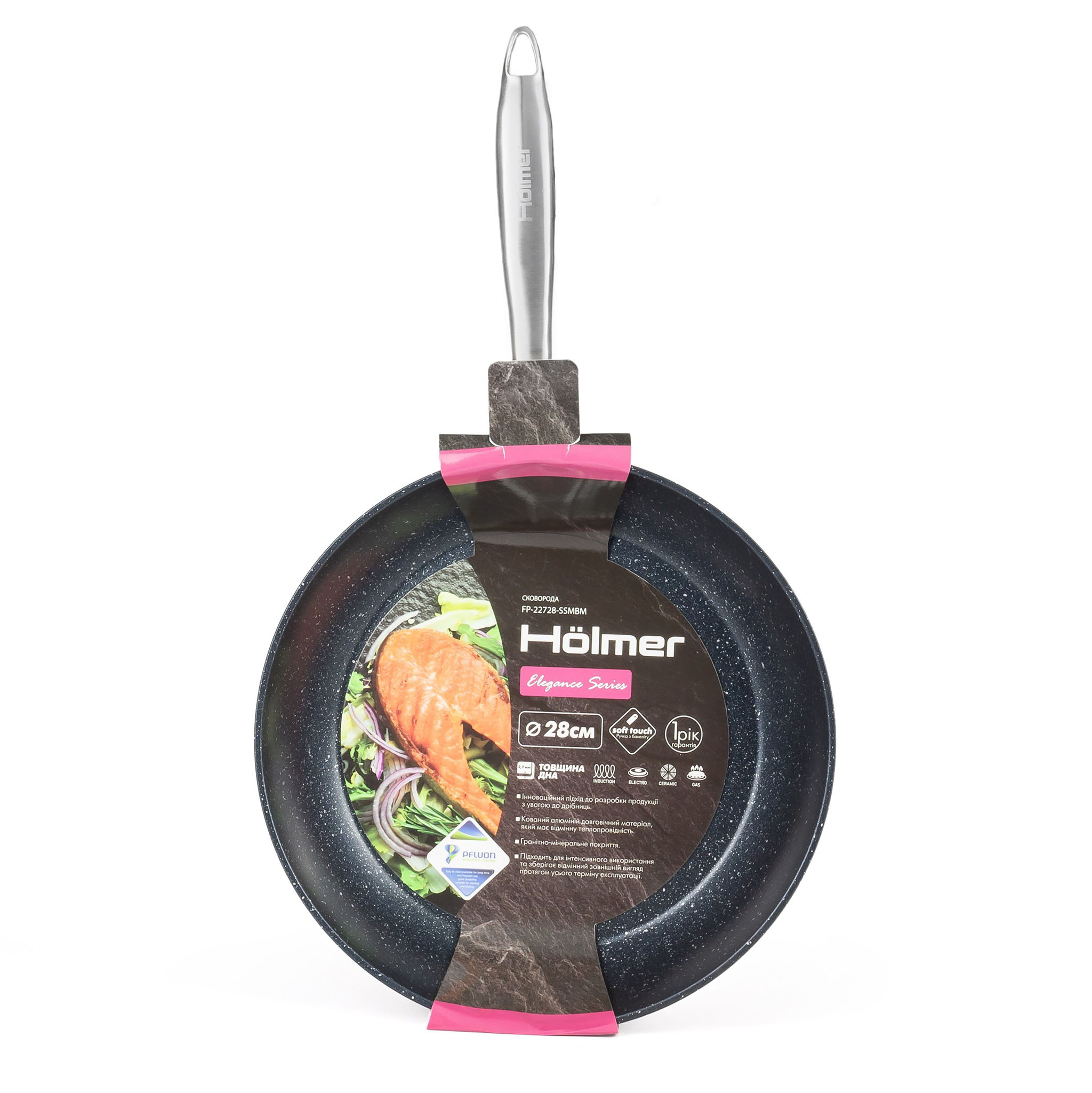 Сковороди Hölmer серії Elegance - це посуд, який має стильний дизайн, антипригарне покриття PFULTON. Тришарове мармурове покриття має чудові експлуатаційні характеристики. Використання спеціального крапельно-дисперсного нанесення фінішних шарів створює унікальне по структурі тришарове покриття з ефектом мармуру.