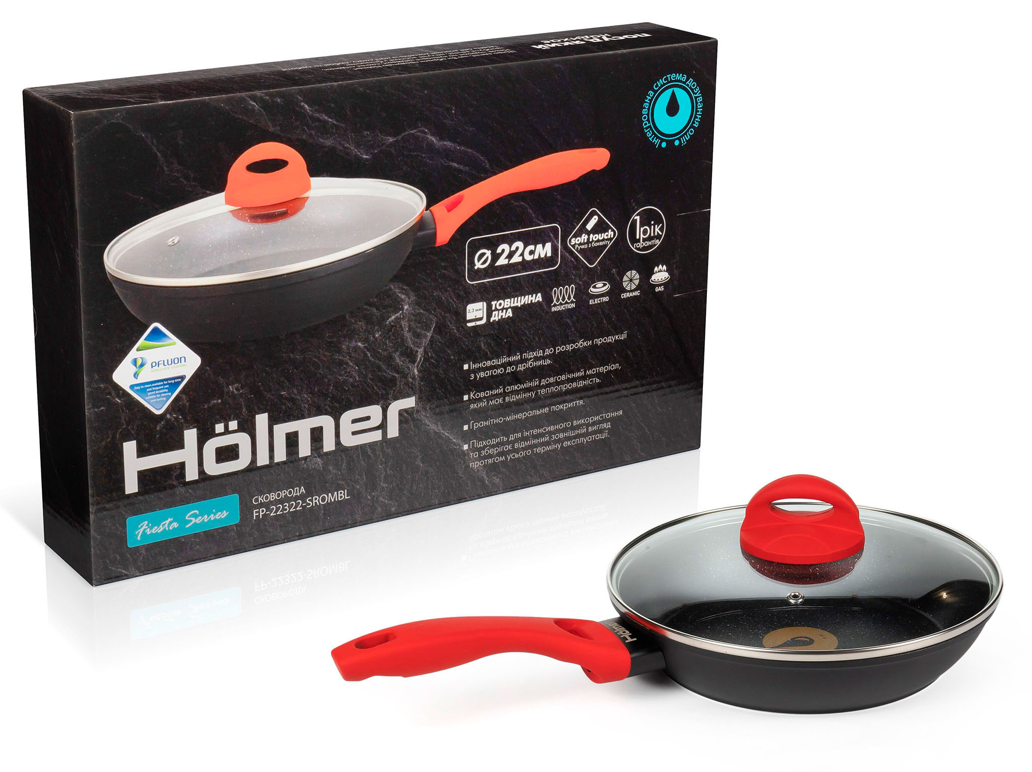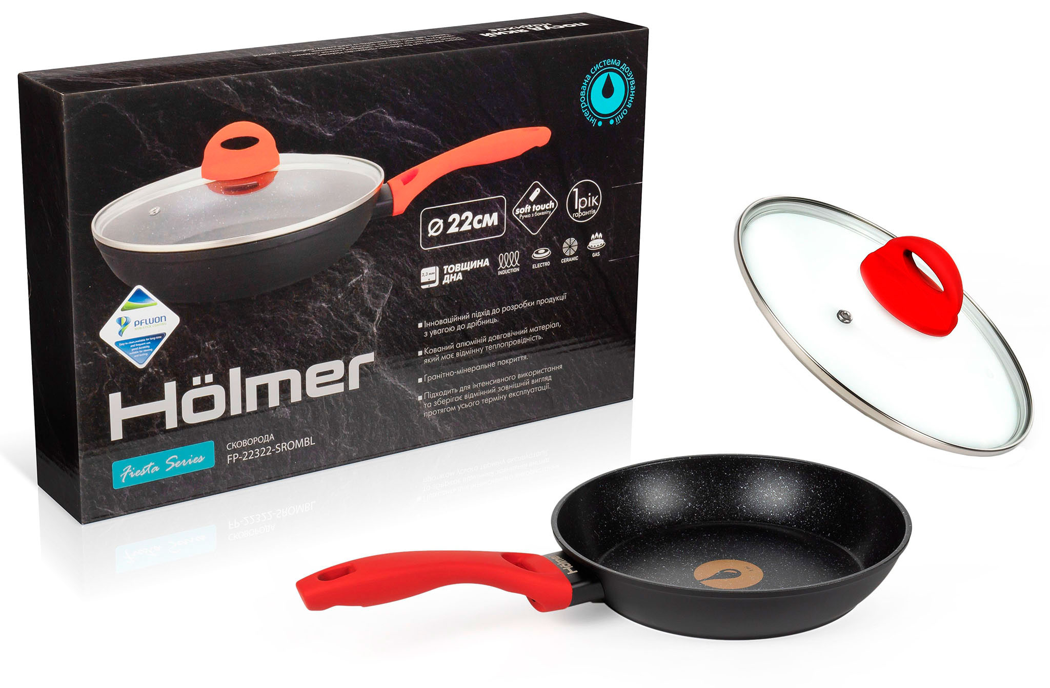 Сковороди Hölmer серії Fiesta - це посуд, який має стильний дизайн, антипригарне покриття PFULTON. Тришарове мармурове покриття має чудові експлуатаційні характеристики. Використання спеціального крапельно-дисперсного нанесення фінішних шарів створює унікальне по структурі тришарове покриття з ефектом мармуру.