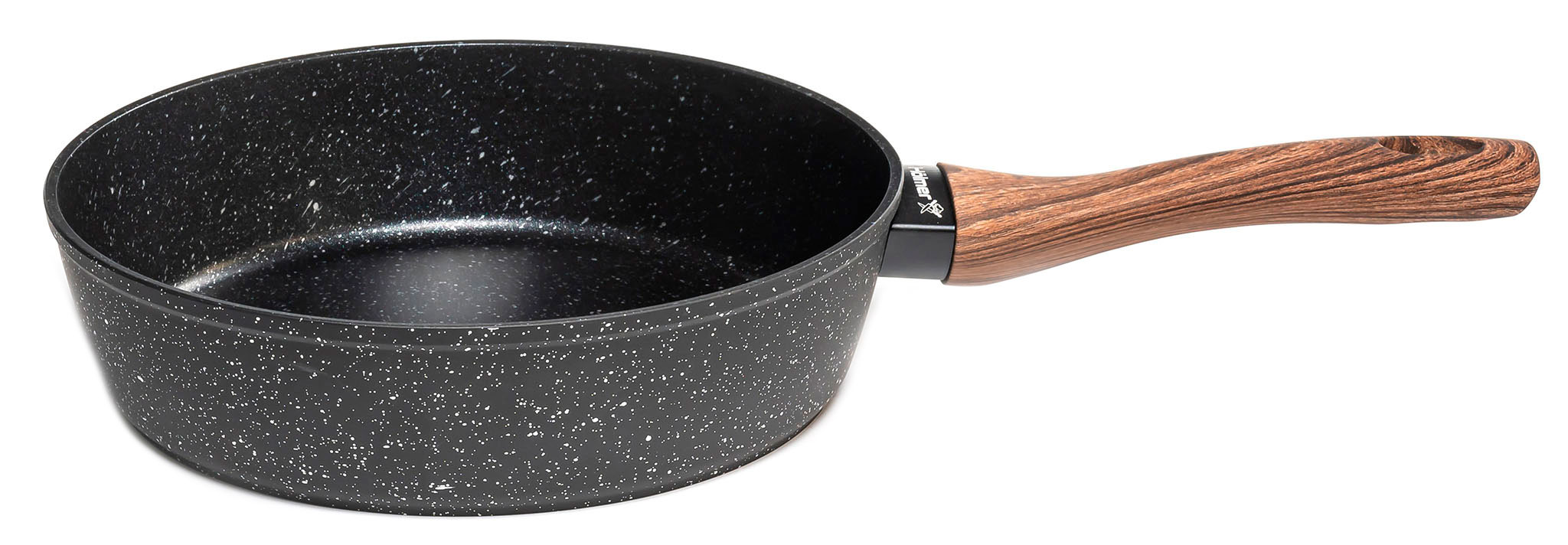 Колір сотейника - чорний, що надає йому елегантний та сучасний вигляд. Ручки сотейника мають кольорове покриття, що нагадує текстуру дерева, створюючи природний та затишний вигляд, а також забезпечують комфортний та безпечний захват.
