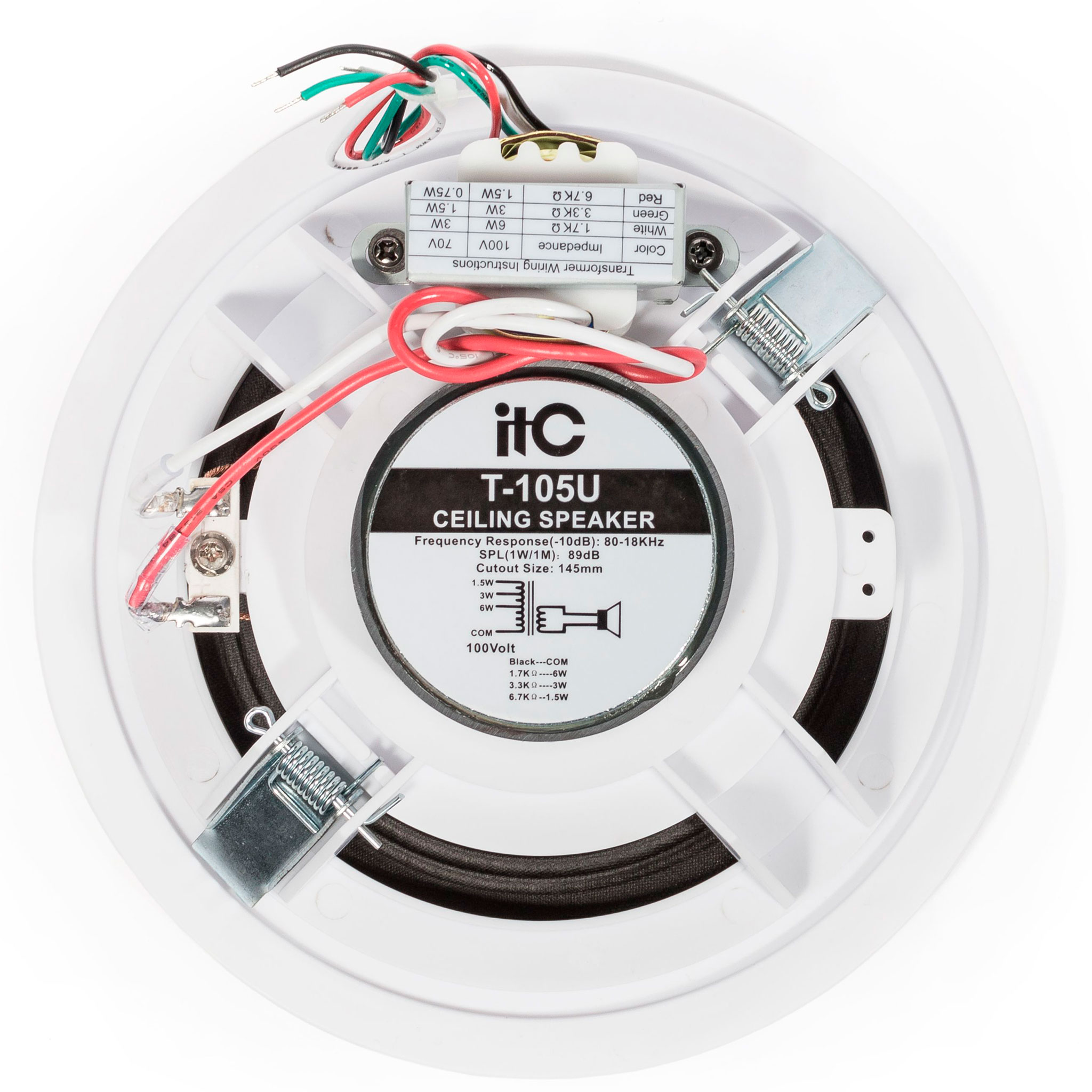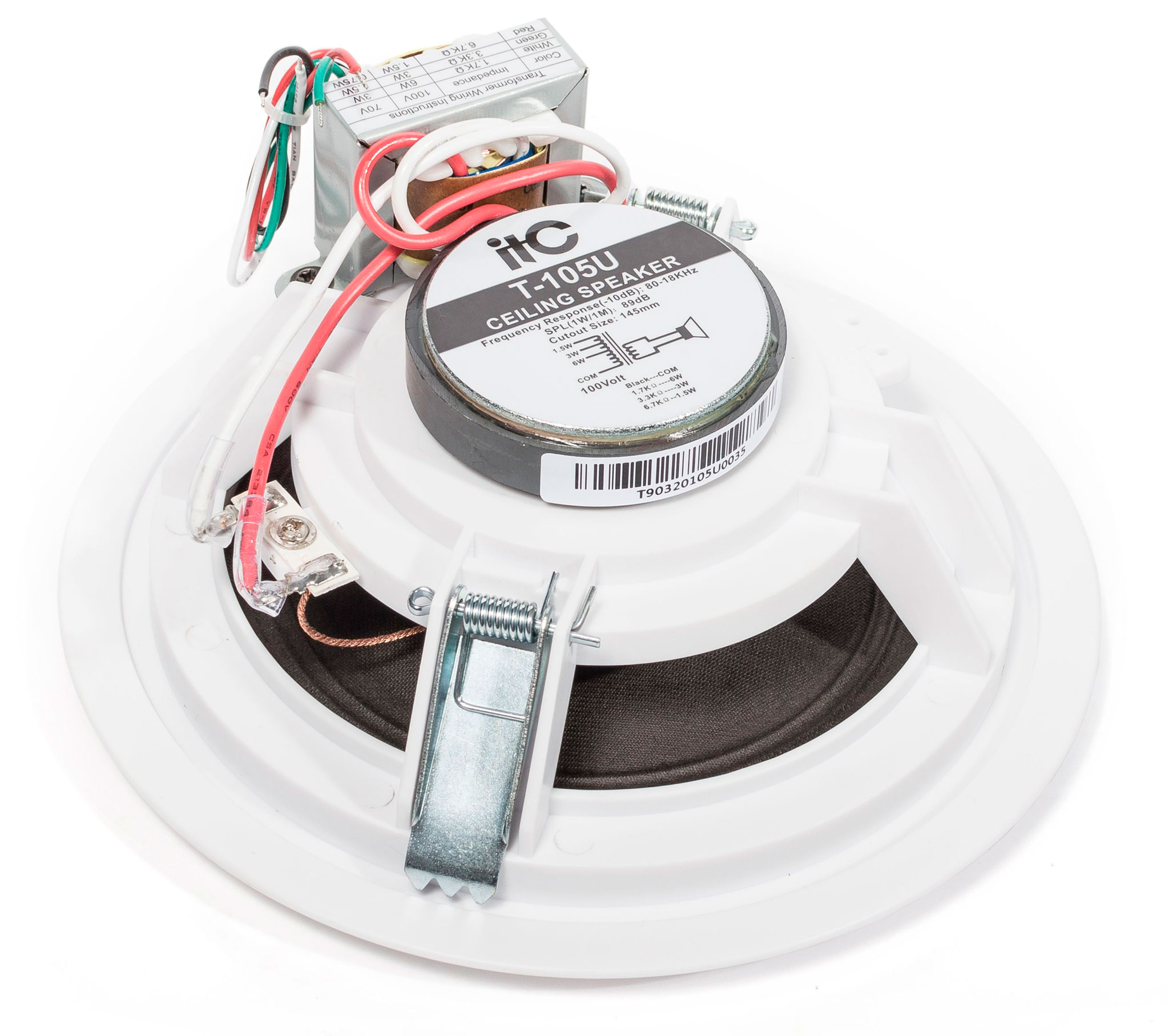 T-105U - это потолочный громкоговоритель со встроенным трансформатором 70/100 В. Применение трансформатора 70/100 В снижает потери в линии на больших расстояниях и позволяет подключать большое количество громкоговорителей параллельным соединением.