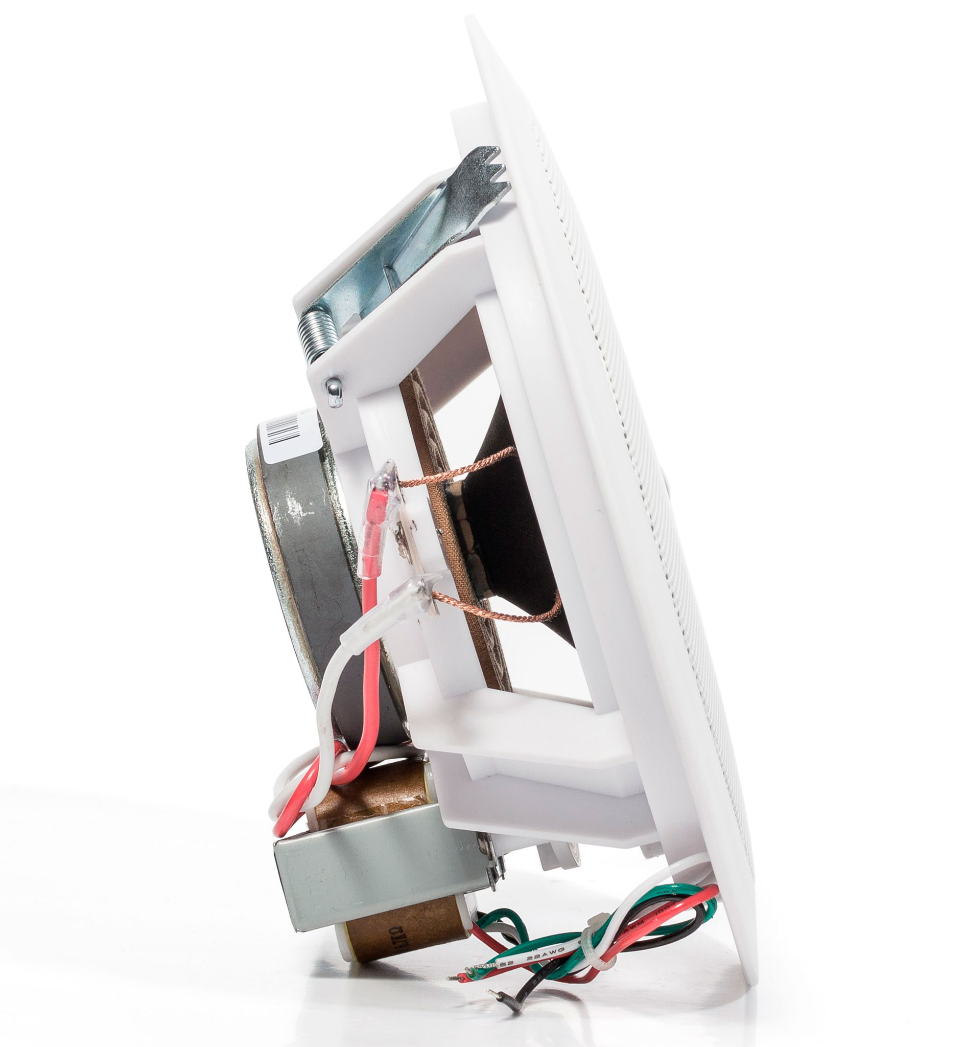 Динамик двух полосный, коаксиального типа 5″ +1,5″, имеет широкий частотный диапазон 80 Гц -20 кГц. Несколько ответвлений трансформатора 0,75 Вт, 1,5 Вт, 3 Вт, 6 Вт для выбора мощности в зависимости от размера комнаты и окружающей среды. Металлическая решетка и корпус из пластика ABS белого цвета. Громкоговоритель для врезного монтажа. Винтовые зажимы обеспечивают простую и безопасную установку.