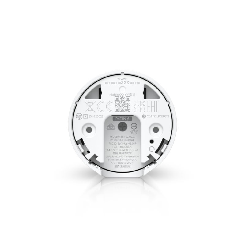 Ubiquiti UniFi 6 Mesh (U6-Mesh) - нова високопродуктивна всепогодна дводіапазонна точка доступу, яка використовує передові технології WiFi 6 для забезпечення потужного безпровідного покриття в корпоративних мережах. Забезпечує сукупну пропускну здатність на рівні 2.7 Gbps в діапазонах 5 GHz (4x4 MU-MIMO і OFDMA) і 2.4 GHz 4x4 MIMO.