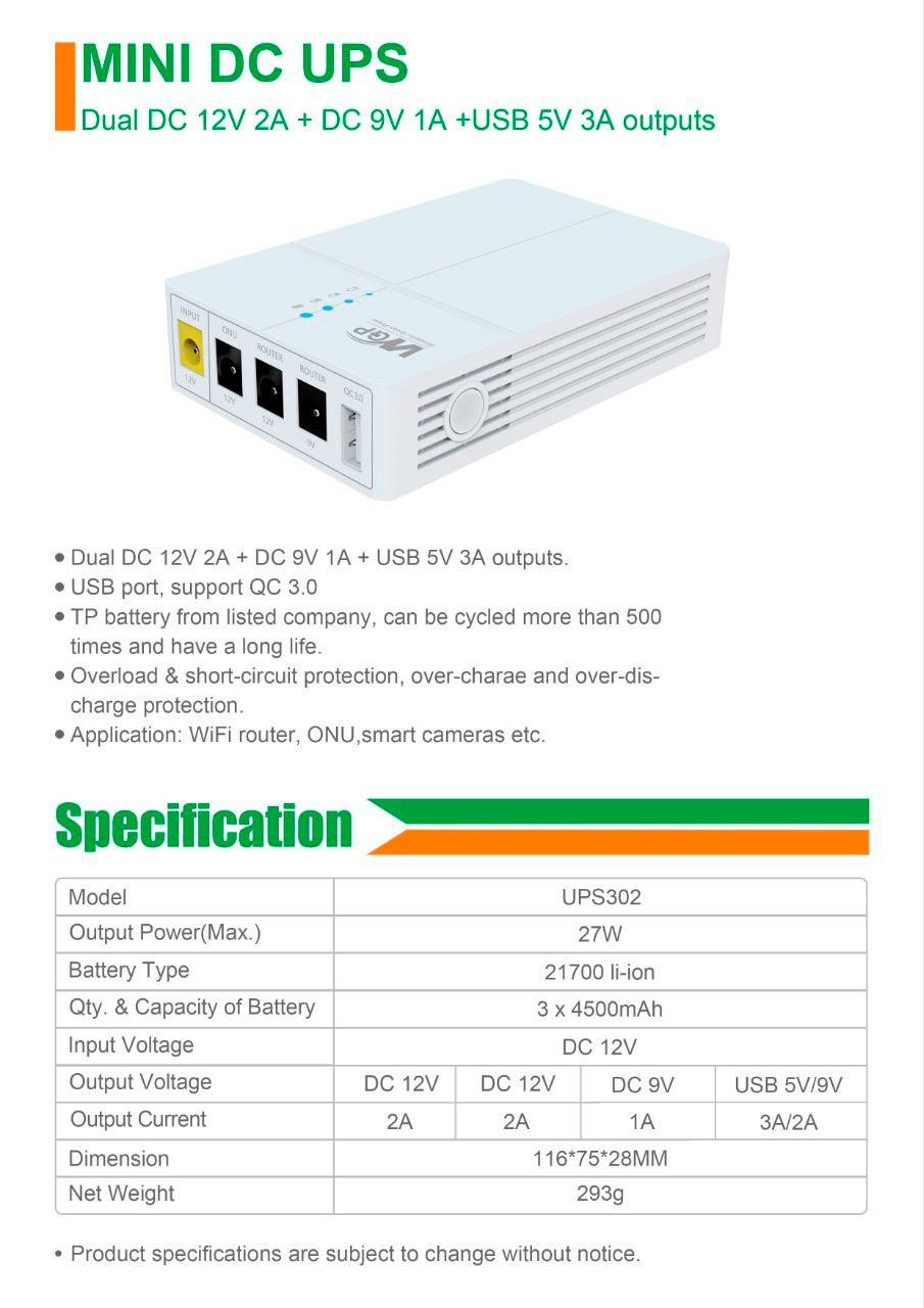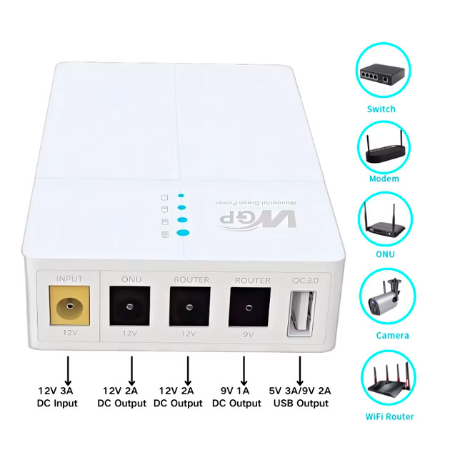 Джерело безперебійного живлення WGP UPS 302 призначено для забезпечення довгострокової автономної роботи обладнання з живленням 12В, 9В чи 5В. Рекомендується резервувати по живленню Wifi роутери, IP-телефони, камери відеоспостереження, Ethernet комутатори, xPON ONU, касові апарати, домофони та домофони.