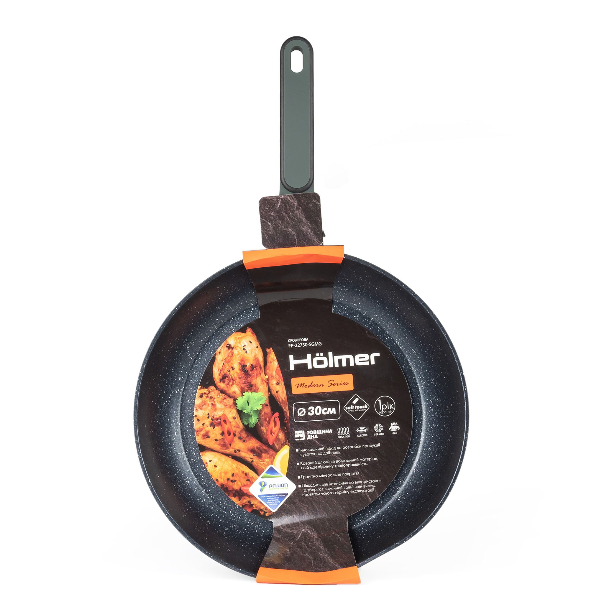 Сковороди Hölmer серії Modern - це посуд, який має стильний дизайн, антипригарне покриття PFULTON. Тришарове мармурове покриття має чудові експлуатаційні характеристики. Використання спеціального крапельно-дисперсного нанесення фінішних шарів створює унікальне по структурі тришарове покриття з ефектом мармуру.