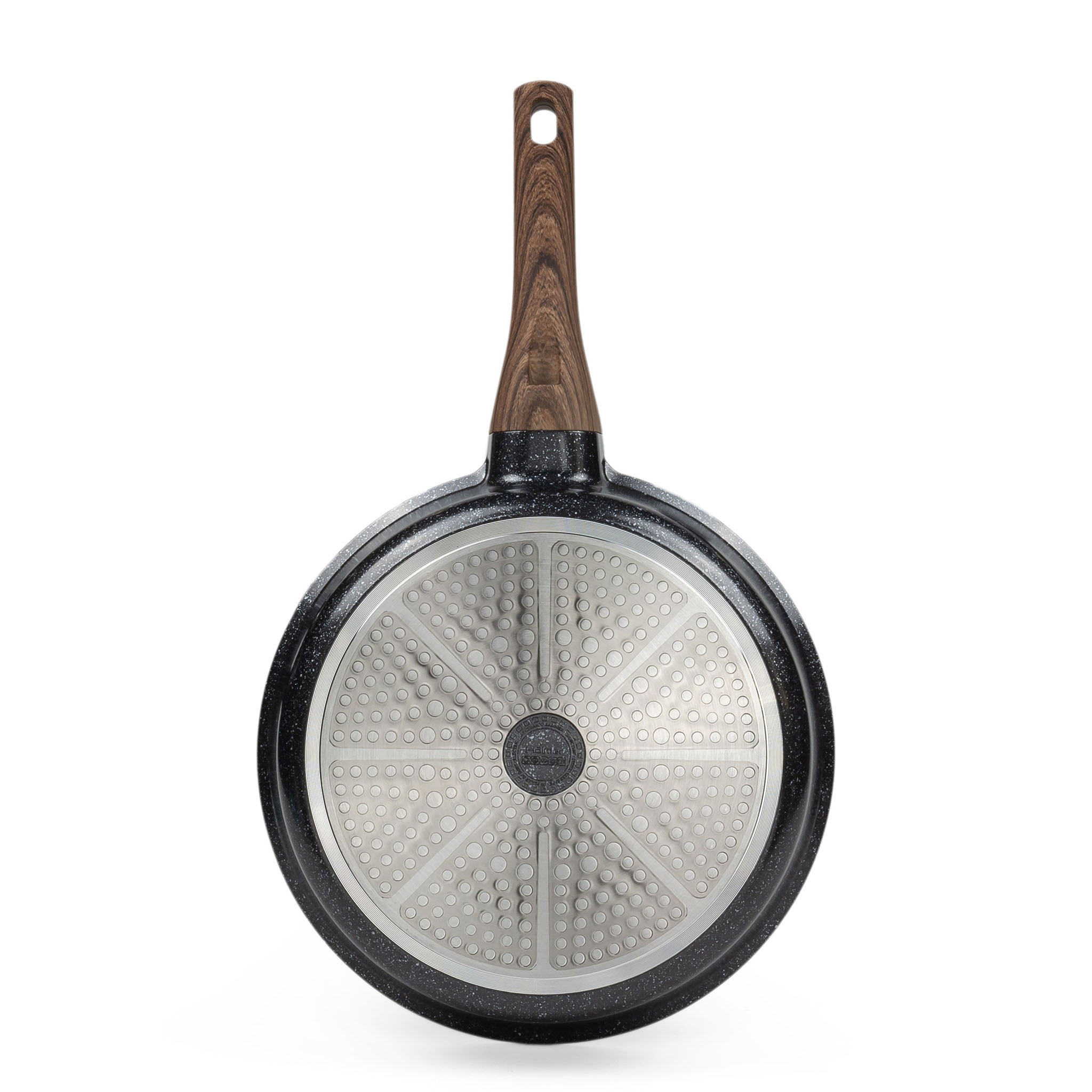 Сковороди серії Nature виготовлені із літого алюмінію, товщиною 3,5 мм, ця сковорідка нагрівається швидко та рівномірно. Що значно прискорює процес приготування, а також перешкоджає пригоранню і нерівномірному просмажуванню продуктів.