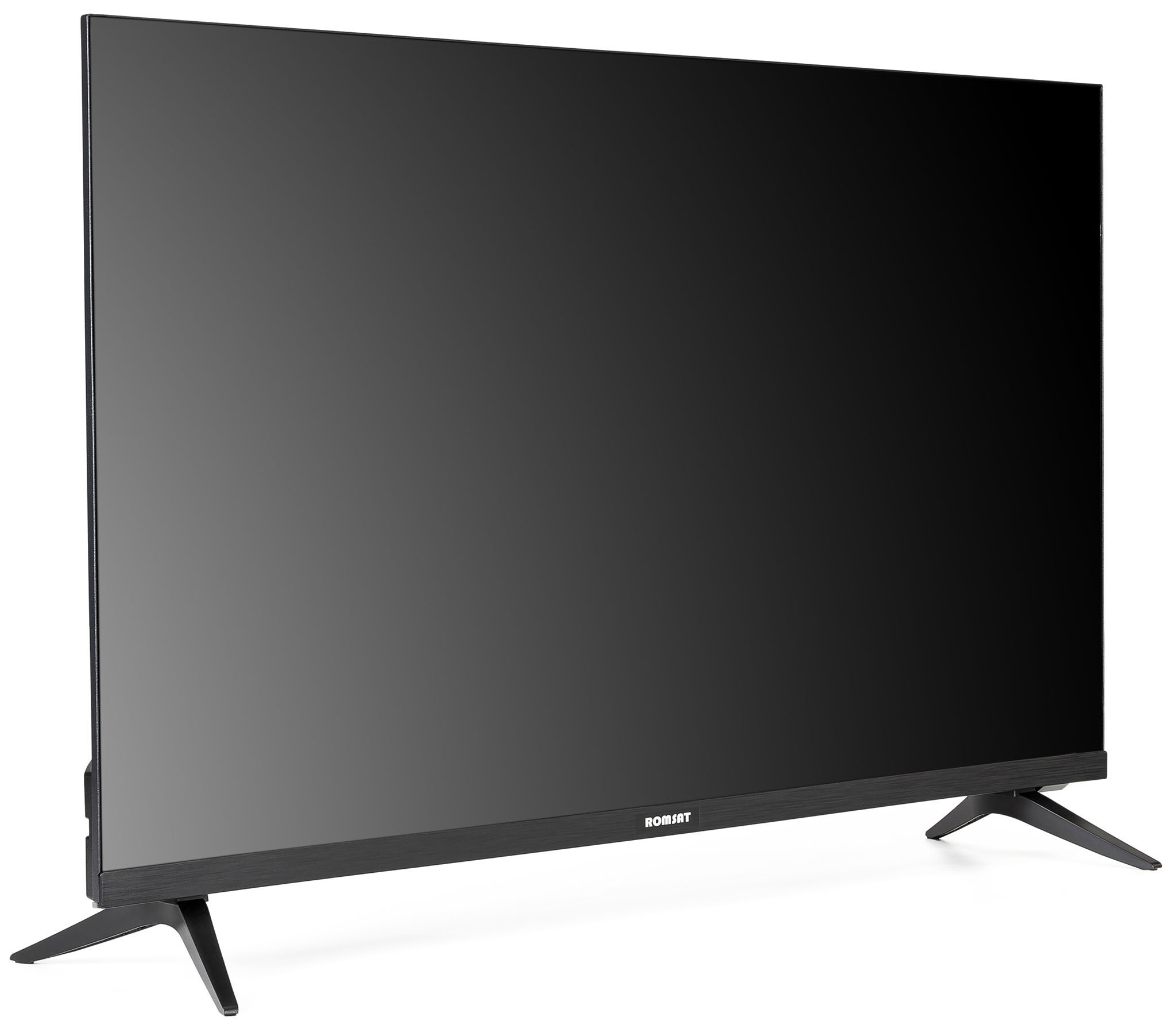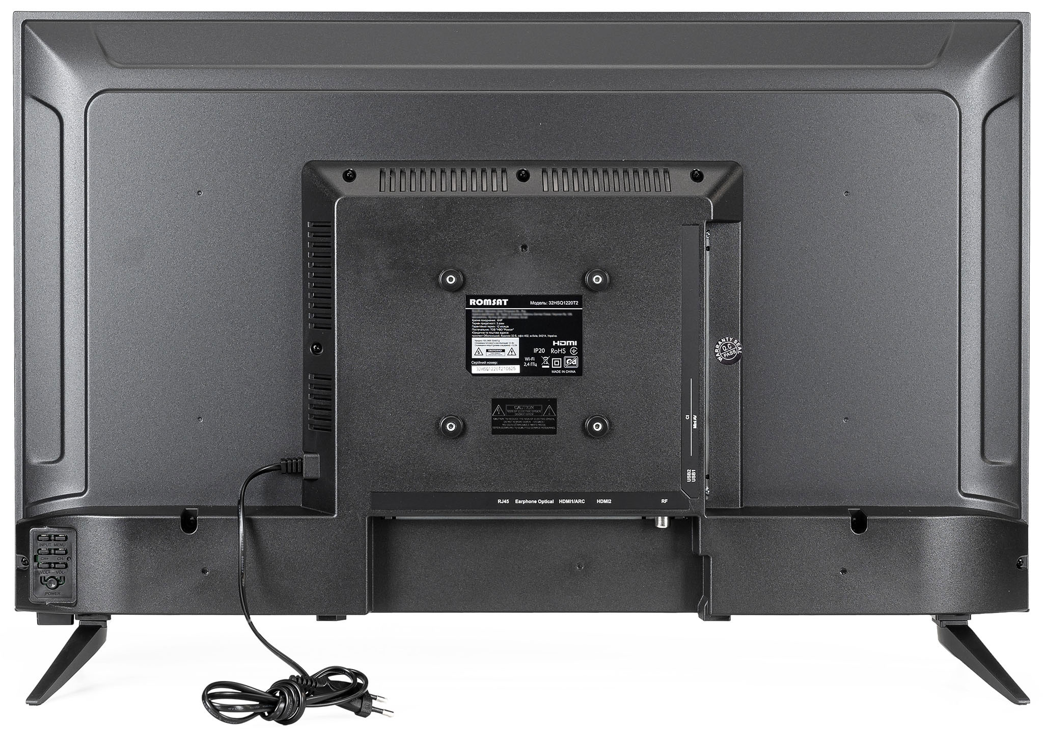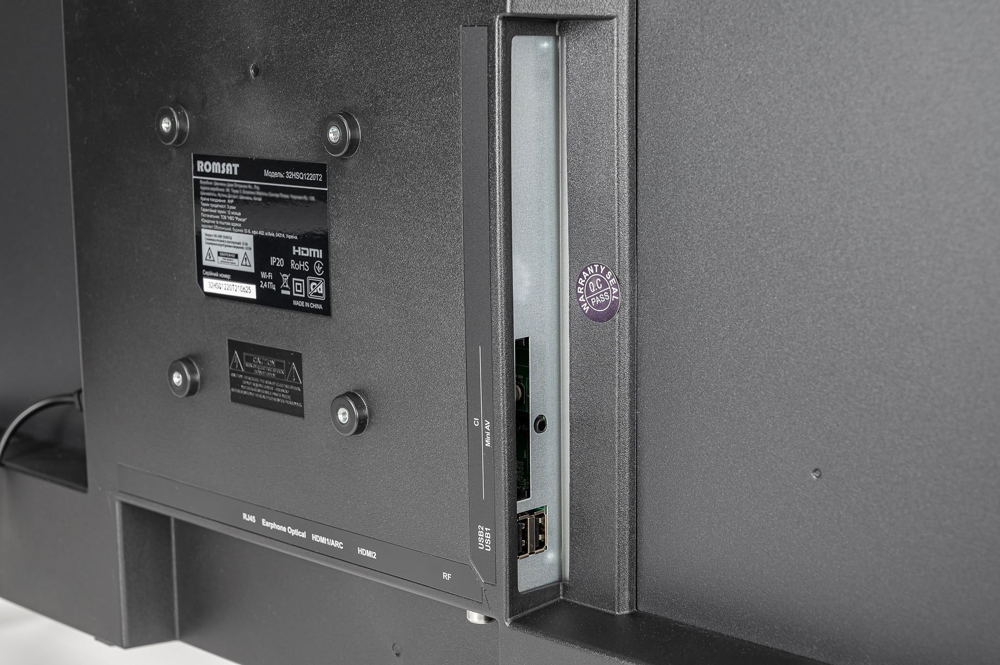 Корпус Romsat 32НSQ1220T2 виготовлений за безрамковою технологією. Така сучасна модель чудово доповнить будь-який інтер'єр. Телевізор має стійкі ніжки, за допомогою яких він надійно розміщується на тумбі. Для настінного кріплення можна користуватися спеціальними кронштейнами VESA (100х100 мм).