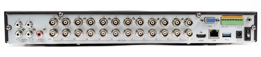 RV9924HD - бюджетний 24-х канальний відеореєстратор, призначений для підключення від 1-ї до 24-х камер відеоспостереження, підтримує синхронний запис 4-х аудіомікрофонів. Має місце під установку двох жорстких дисків 3,5", обсягом до 16ТБ, 2xUSB для підключення миші і копіювання архіву, виходи HDMI і VGA для підключення монітора.