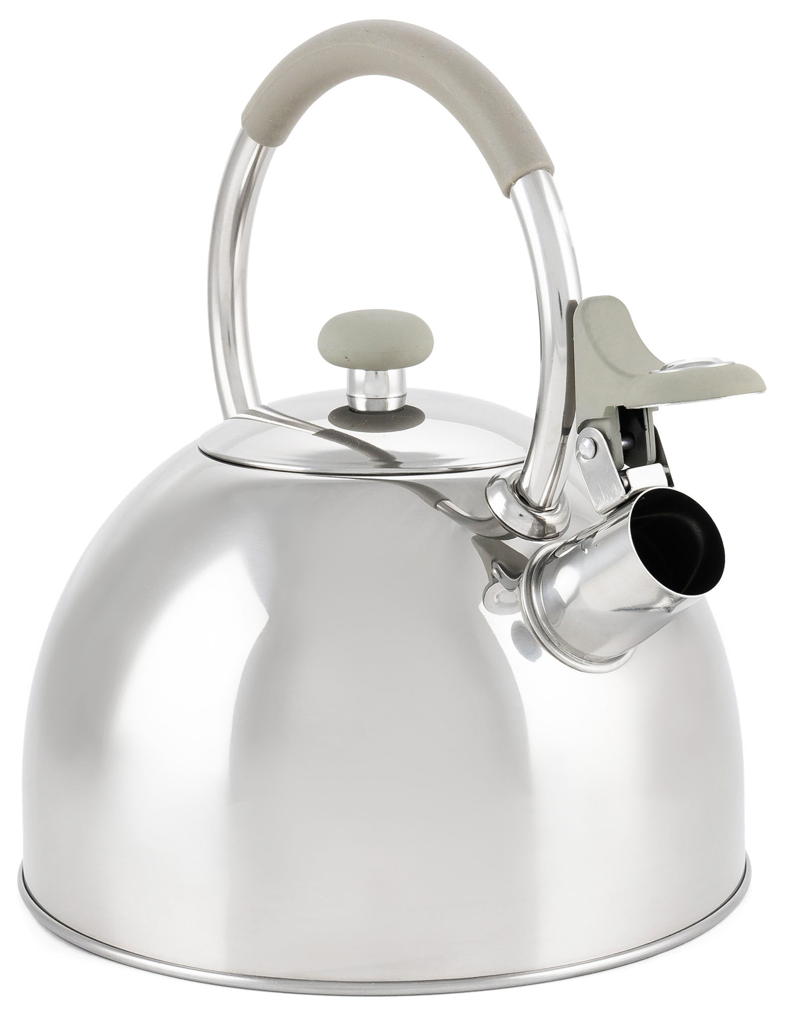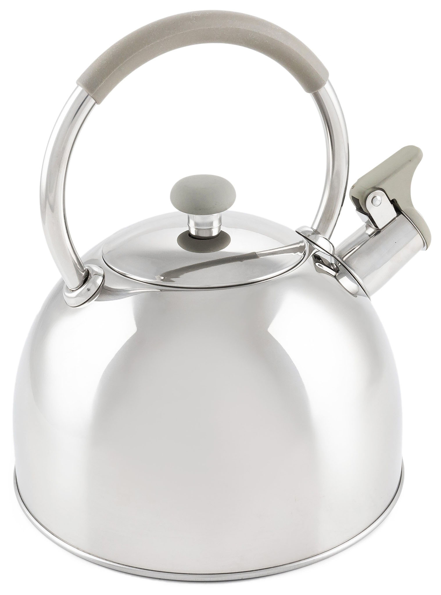 Для безпечного та зручного користування, чайник отримав термостійкі бакелітові ручки сірого кольору та кнопкою відкриття носика. Корпус свистка також виконано з бакеліту, який захистить від випадкових опіків під час використання.