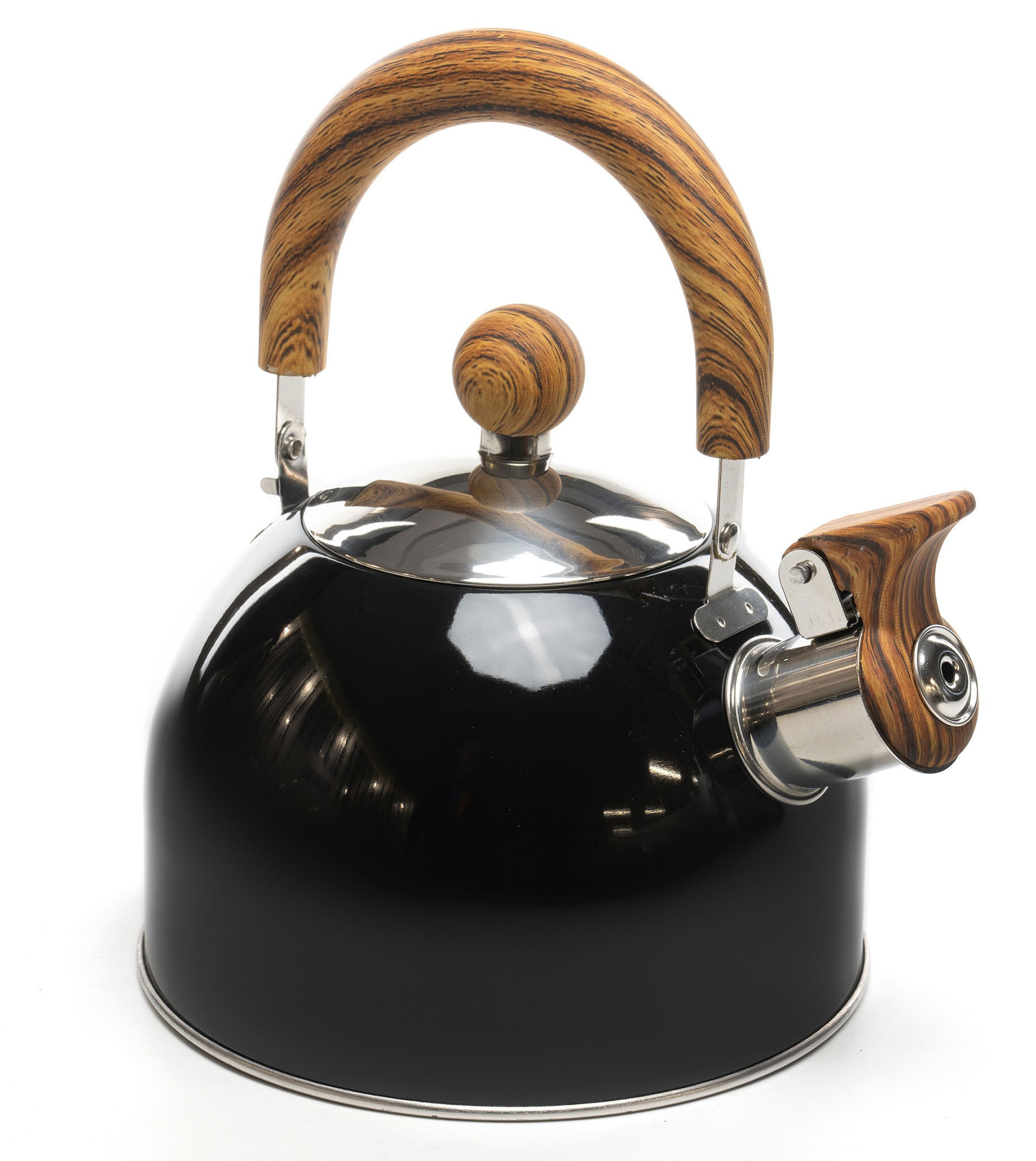 Для безпечного та зручного користування, чайник отримав термостійкі бакелітові ручки та кнопкою відкриття носика. Корпус свистка також виконано з бакеліту, який захистить від випадкових опіків під час використання.