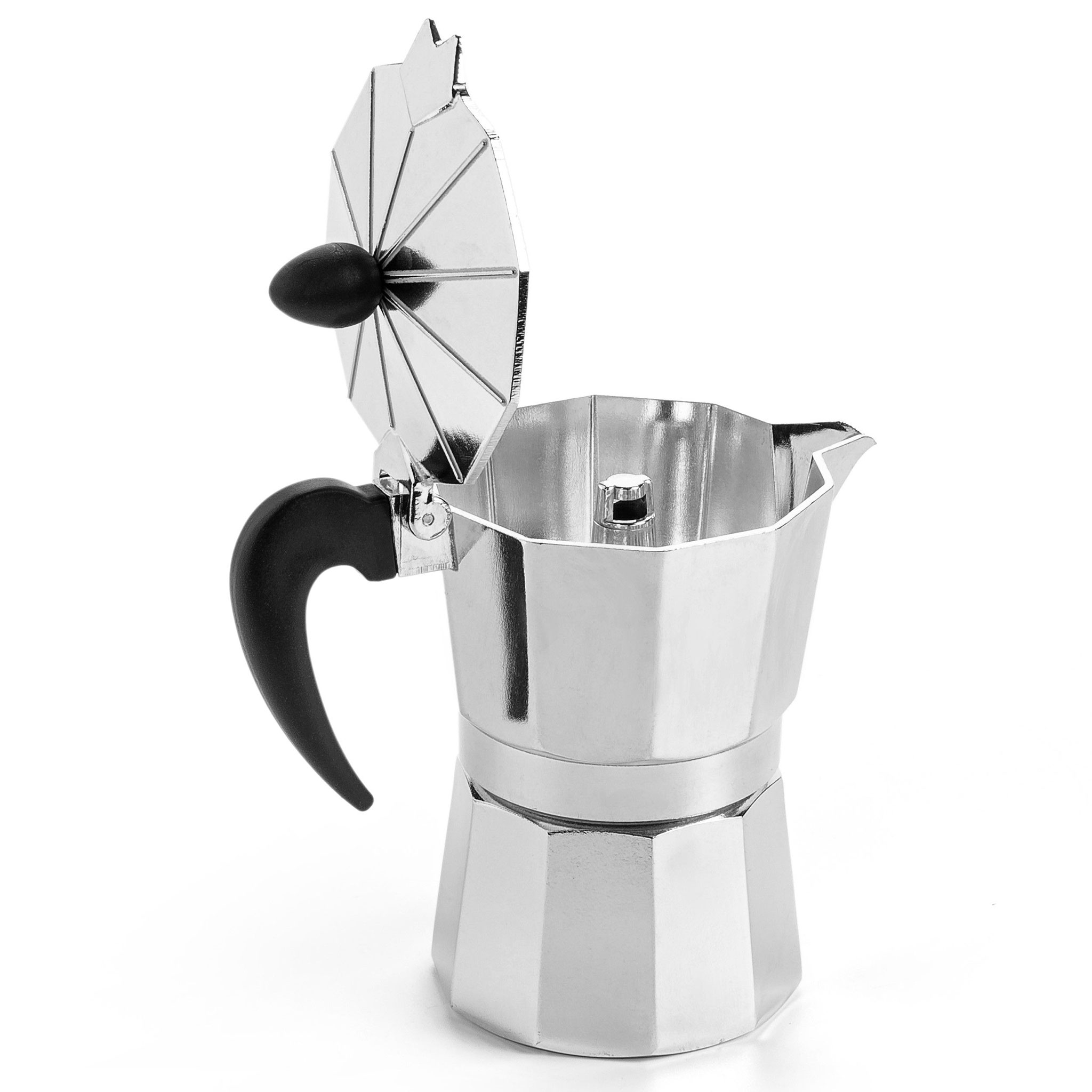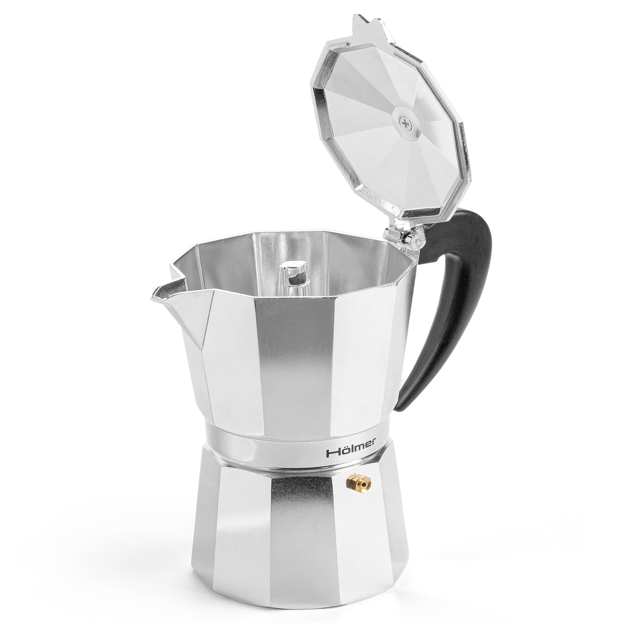 Сучасна гейзерна кавоварка Hölmer зроблена з високоякісного алюмінію, має зручну бакелітову ручку, яка не нагрівається. Кавоварка складається з двох ємностей, розділених спеціальним фільтром.