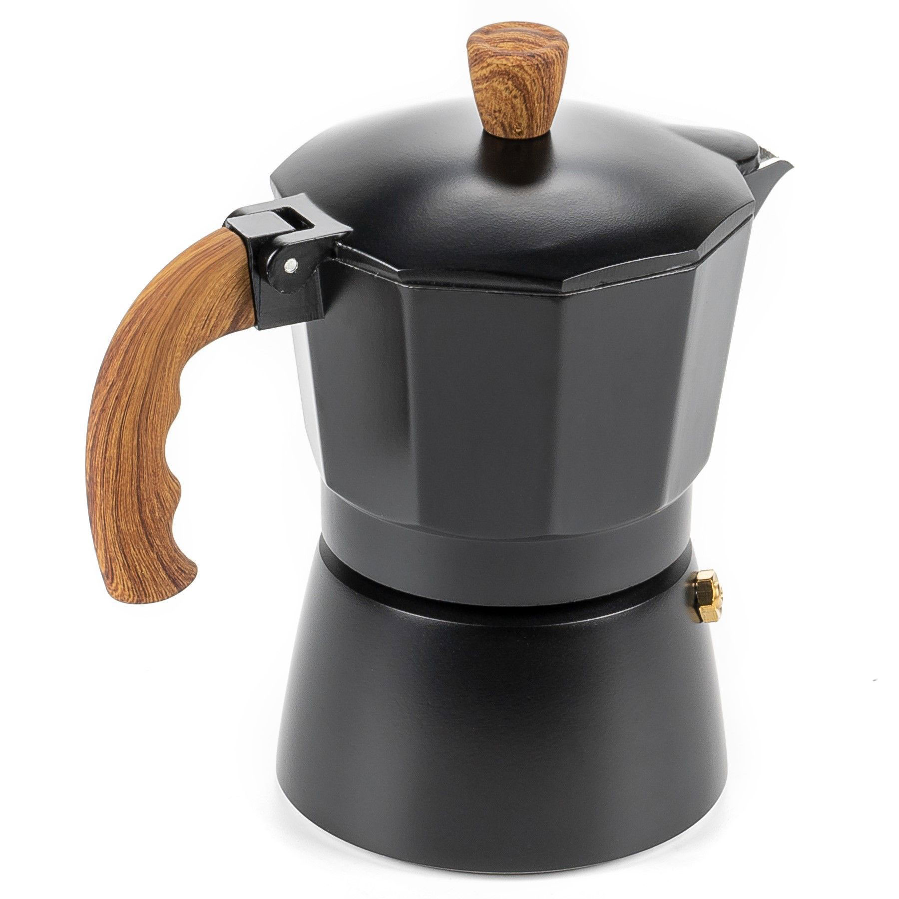 Сучасна гейзерна кавоварка Hölmer зроблена з високоякісного алюмінію, має чорний колір, зручну бакелітову ручку, яка не нагрівається та стилізована під дерево. Кавоварка складається з двох ємностей, розділених спеціальним фільтром.
