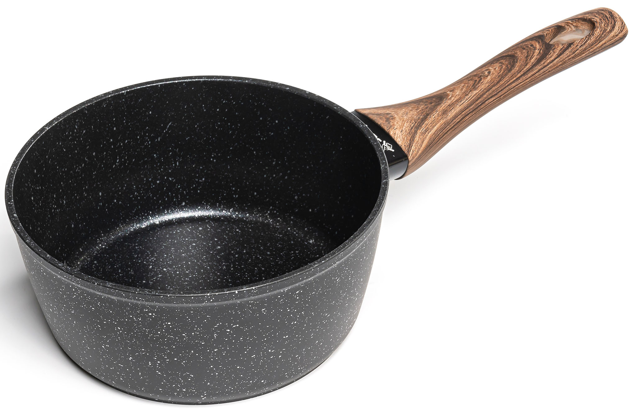 Колір ковша - чорний, що надає йому стильний та сучасний вигляд. Ручка ковша виконана з бакеліту з покриттям SOFT-Touch, що забезпечує комфортний захват та захист від нагрівання. Крім того, ручка має кольорове покриття, що нагадує текстуру дерева, додаючи природну та затишну атмосферу до вашої кухні.