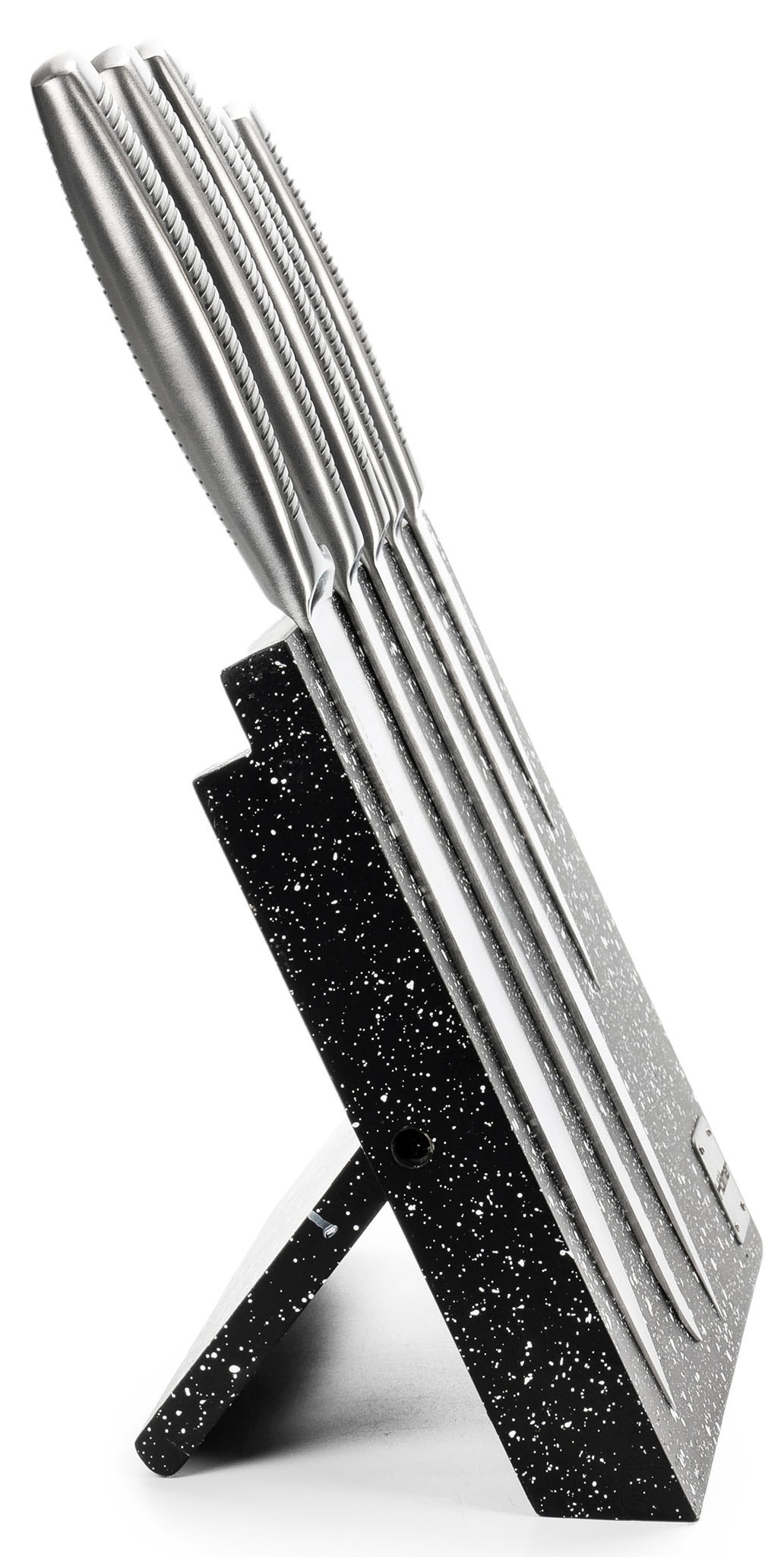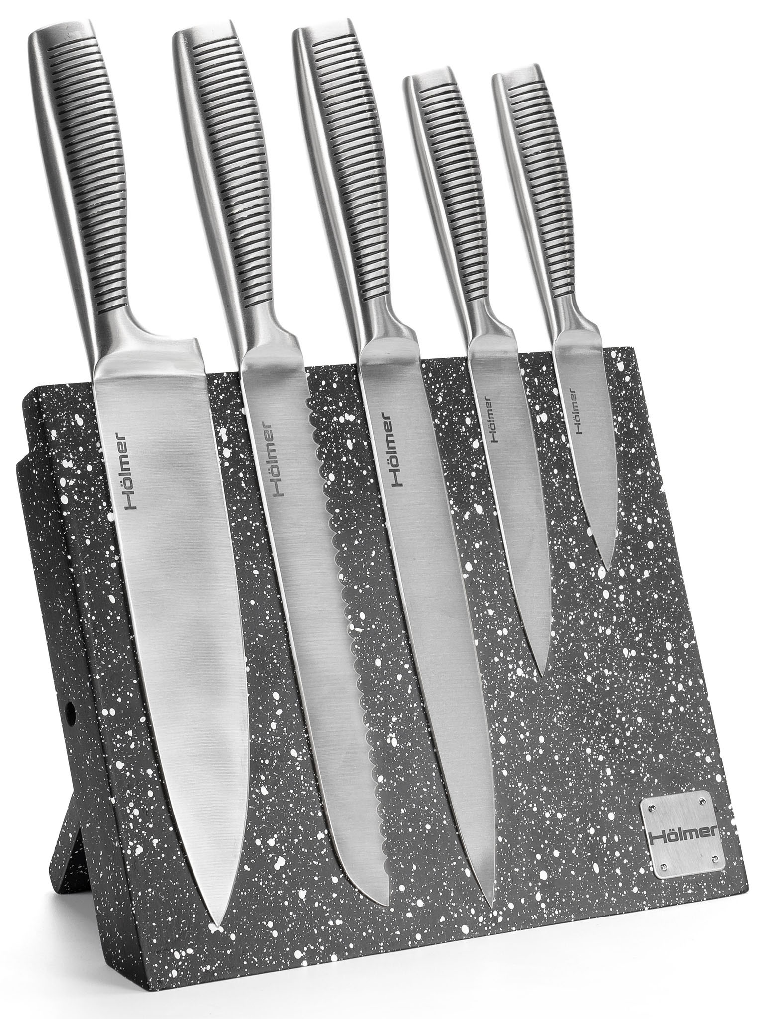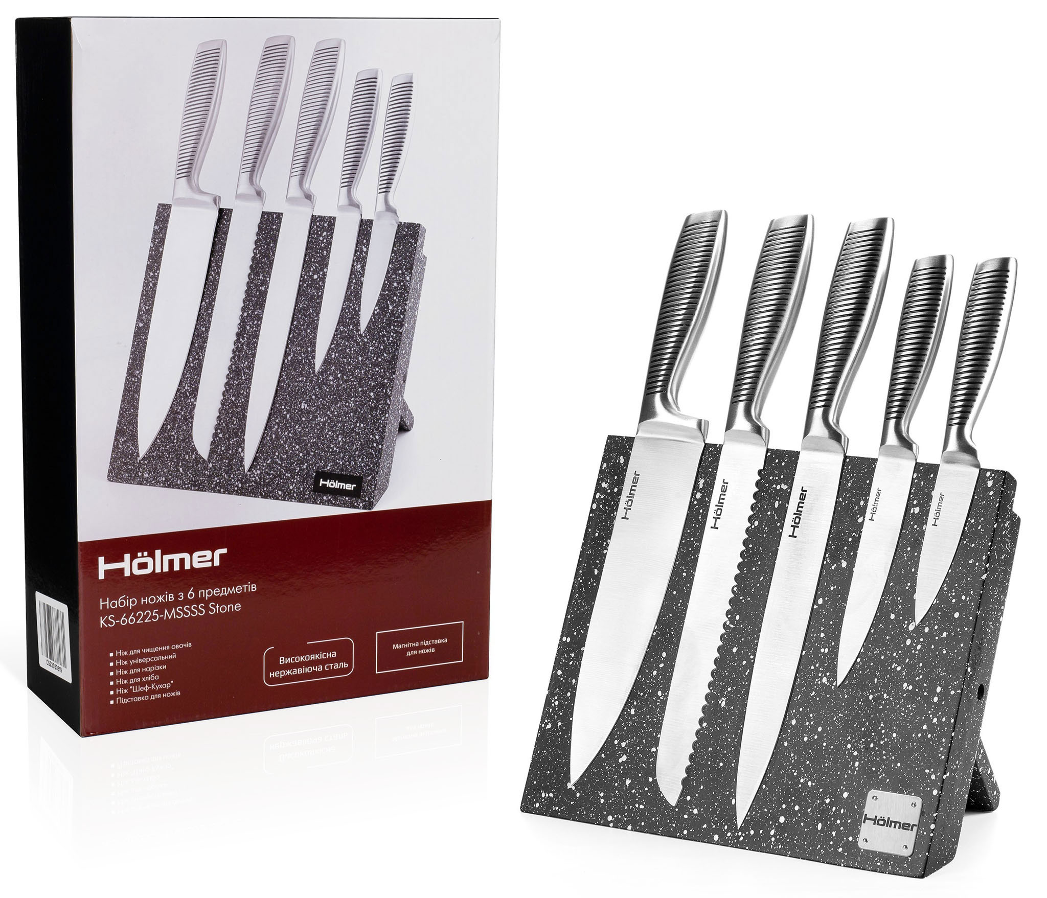 Набір ножів Hölmer KS-66225-MSSSS Stone складається з 6 предметів — п'яти ножів різного призначення з лезами з високоякісної нержавіючої сталі, які стануть ідеальним варіантом для нарізування різноманітних продуктів на вашій кухні, а також підставки з вбудованою магнітною планкою.
